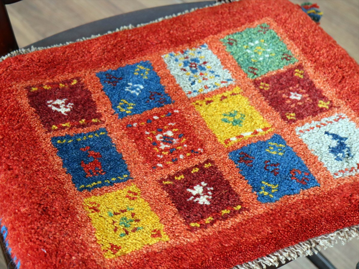 ギャッベ イラン産手織り 座布団サイズ 36×45cm レッド カラフルタイル 生命の樹と動物