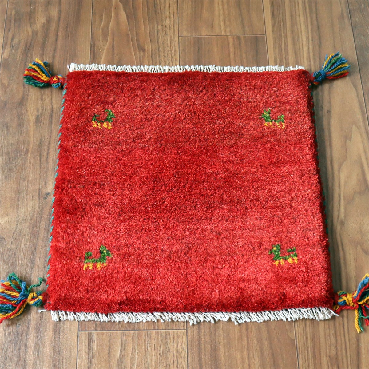 - ギャッベ イラン産手織り 座布団サイズ 41×42cm レッド 動物モチーフ