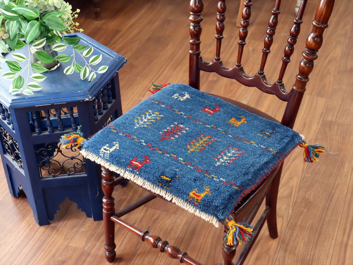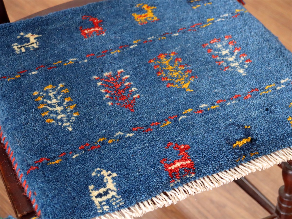 ギャッベ イラン産手織り 座布団サイズ 37×43cm ブルー 動物と連なる生命の樹