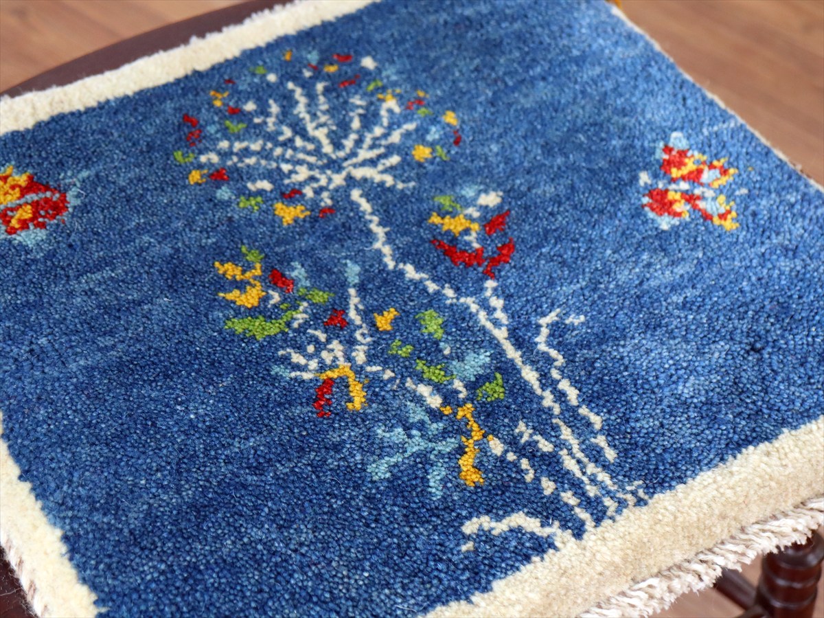 ギャッベ イラン産手織り 座布団サイズ 40×42cm ブルー 蝶々とフラワーデザイン