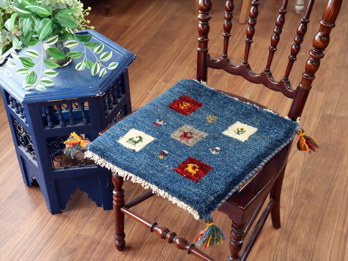 ギャッベ イラン産手織り 座布団サイズ 40×38cm ブルー カラフルタイル 動物と生命の樹