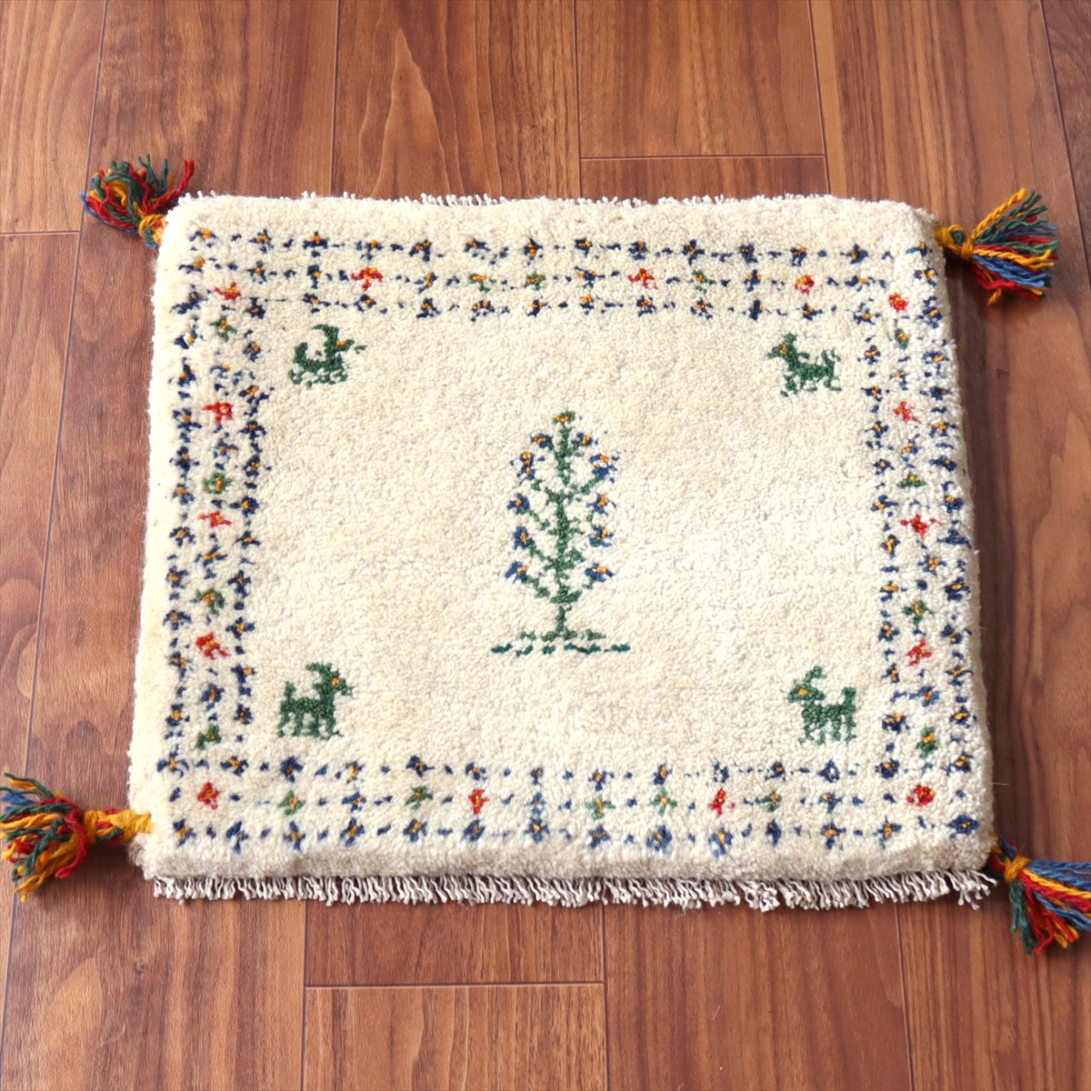 ギャッベ イラン産手織り 座布団サイズ 41×46cm ナチュラルアイボリー 生命の樹と動物