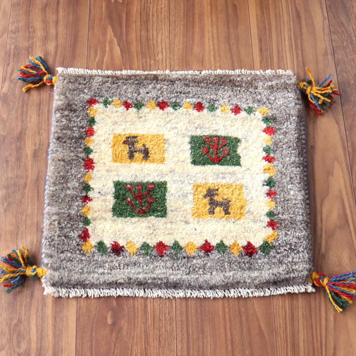 ギャッベ イラン産手織り 座布団サイズ 39×43cm ナチュラルアイボリー カラフルなタイル 動物と生命の樹
