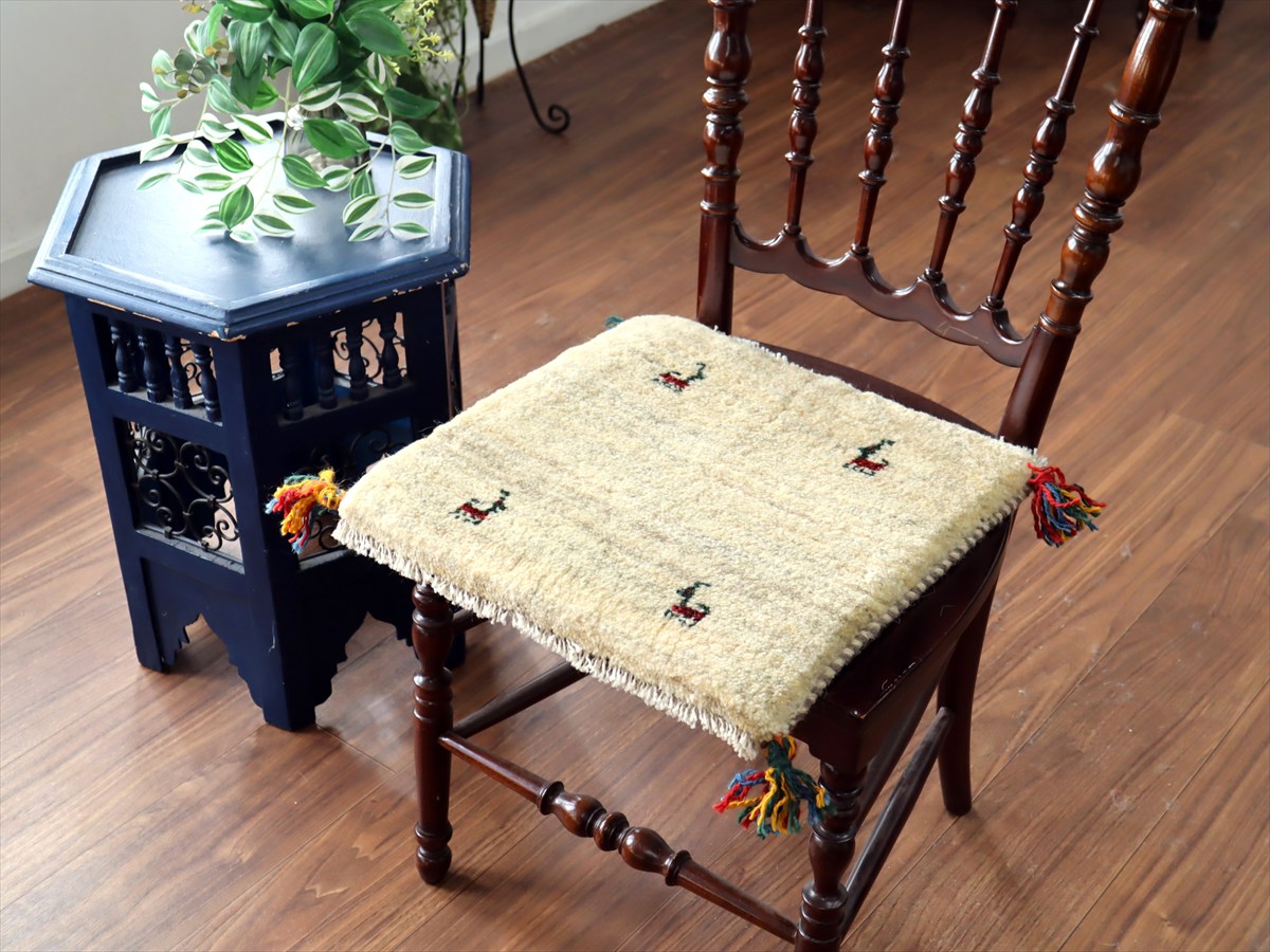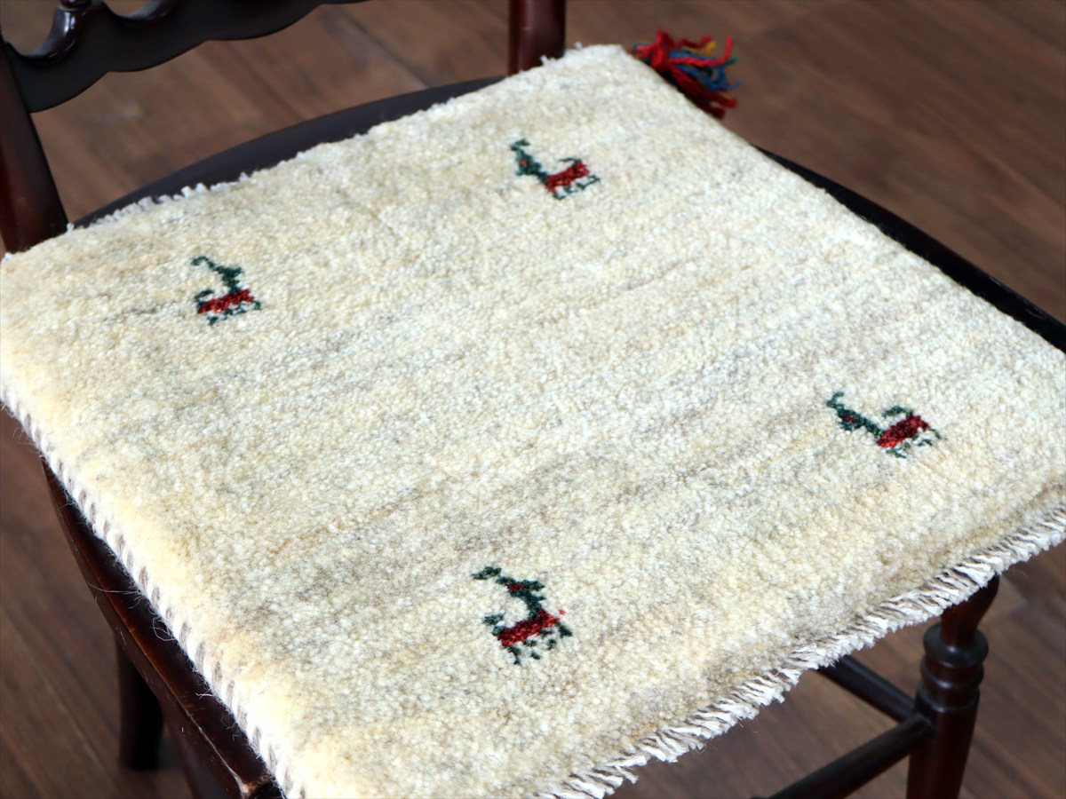 ギャッベ イラン産手織り 座布団サイズ 39×40cm ナチュラルアイボリー 動物モチーフ