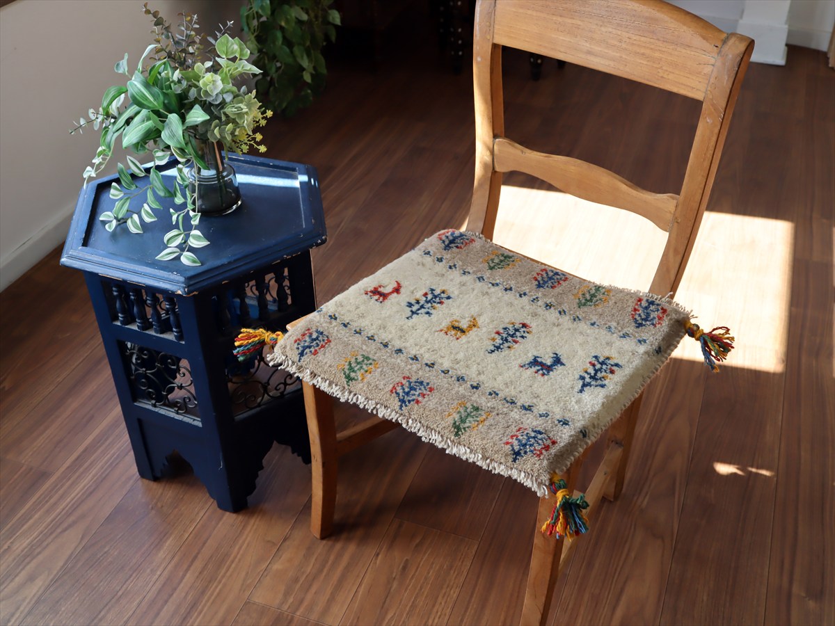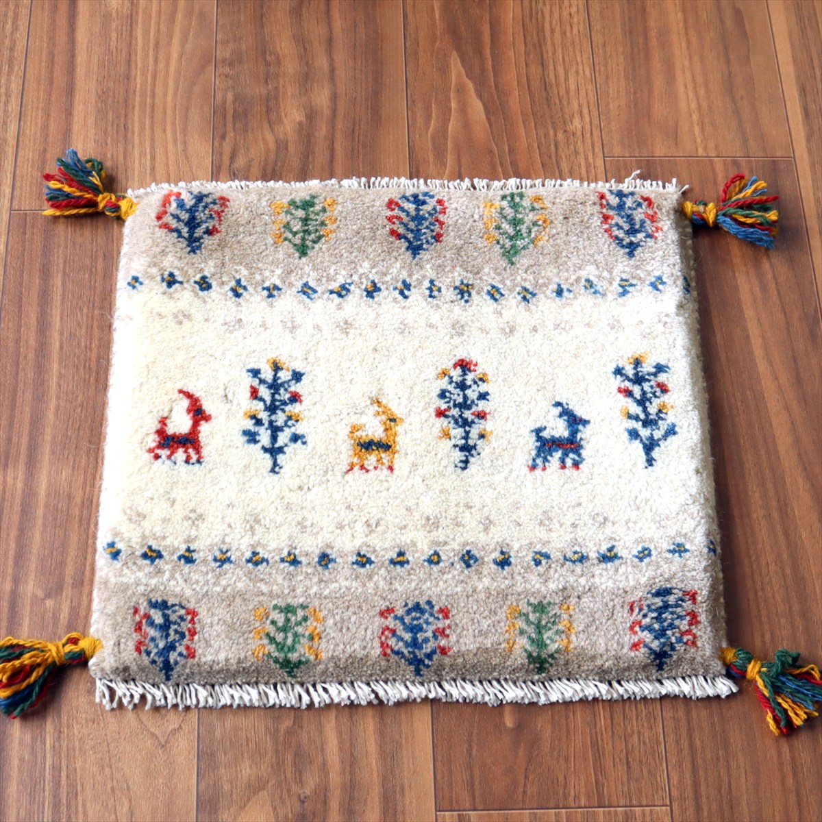- ギャッベ イラン産手織り 座布団サイズ 39×43cm ナチュラルアイボリーカラフルな生命の樹と動物