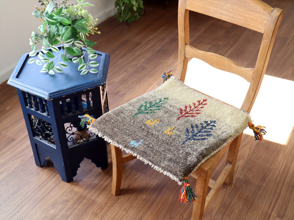ギャッベ イラン産手織り 座布団サイズ 42×41cm ナチュラルアイボリー 生命の樹と動物
