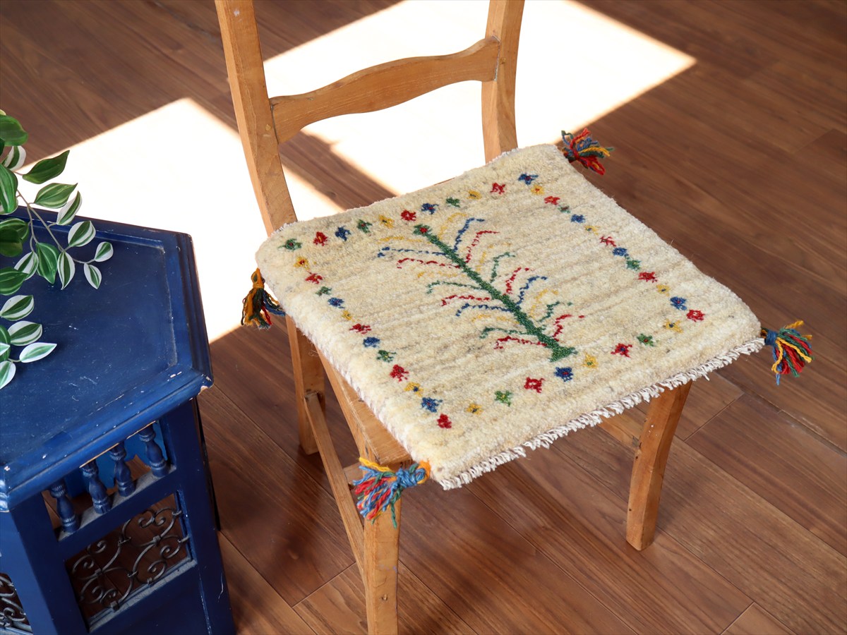 ギャッベ イラン産手織り 座布団サイズ 40×42cm ナチュラルアイボリー カラフルな連なる生命の樹