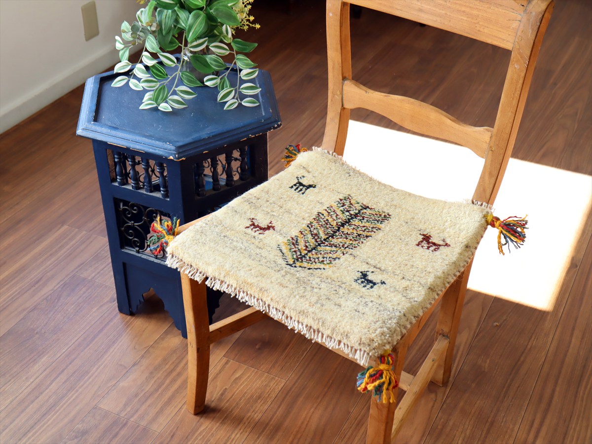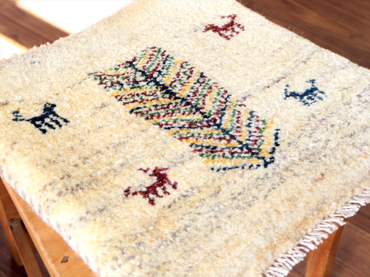 ギャッベ イラン産手織り 座布団サイズ 39×40cm ナチュラルアイボリー 生命の樹と動物