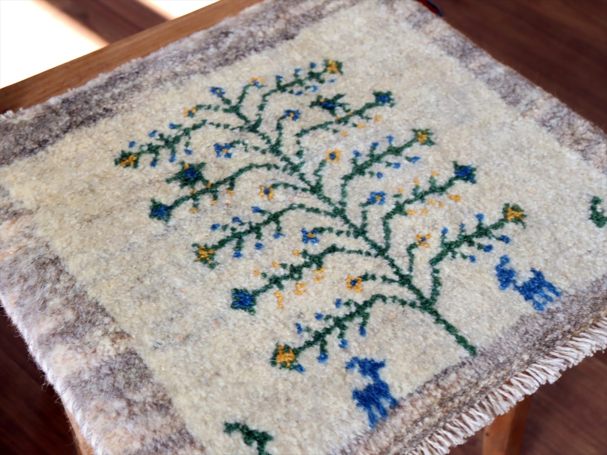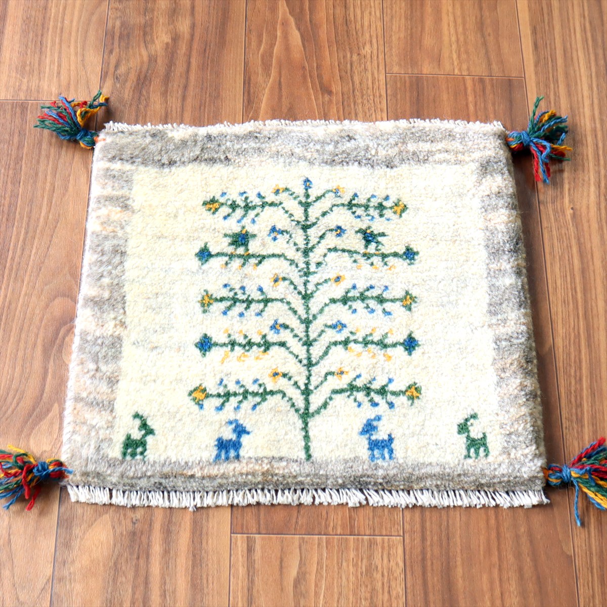 ギャッベ イラン産手織り 座布団サイズ 39×43cm ナチュラルアイボリー 生命の樹と動物