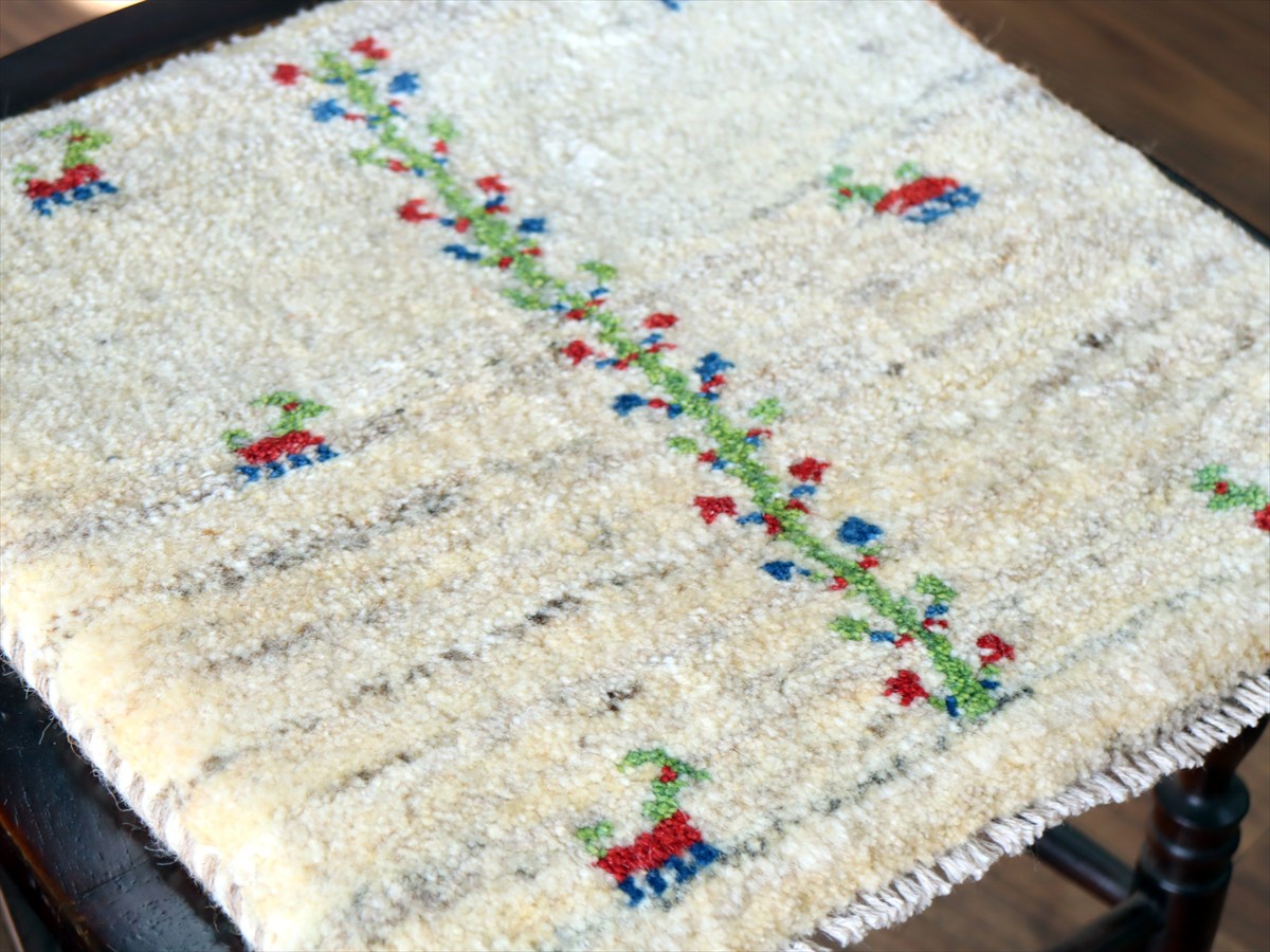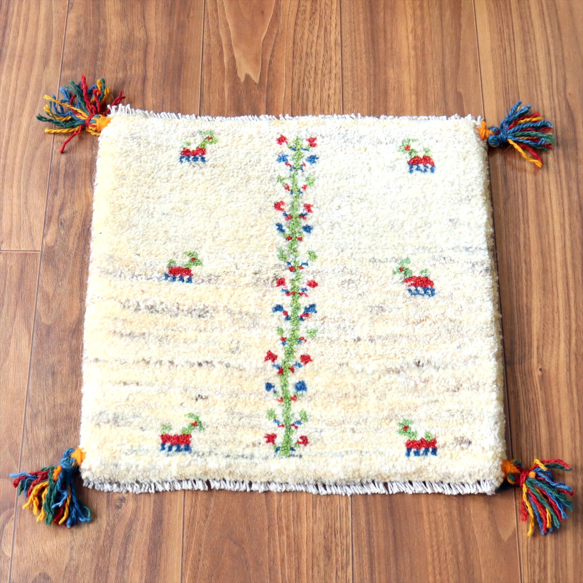 - ギャッベ イラン産手織り 座布団サイズ 39×40cm ナチュラルアイボリー 連なる生命の樹と動物