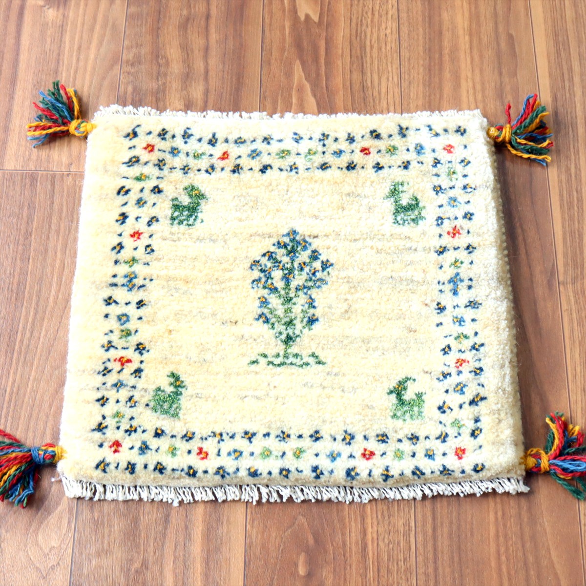ギャッベ イラン産手織り 座布団サイズ 39×43cm ナチュラルアイボリー 生命の樹と動物
