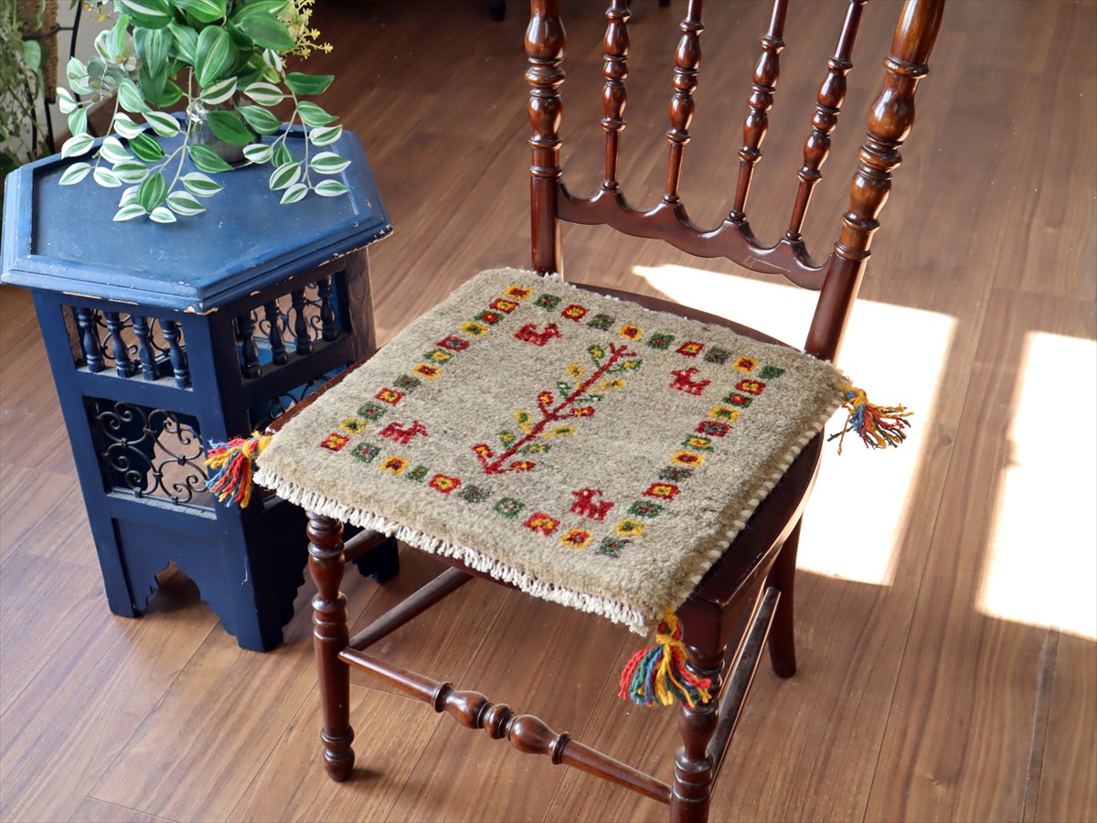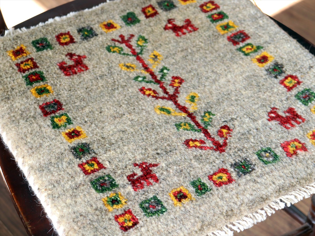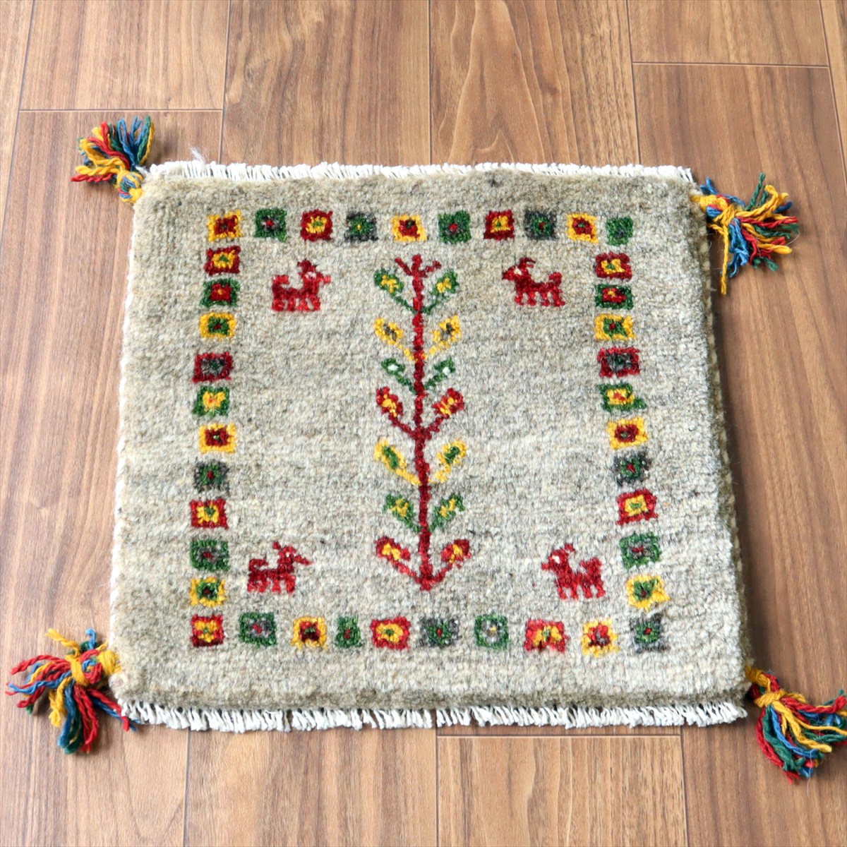 ギャッベ イラン産手織り 座布団サイズ 38×41cm ナチュラルアイボリー 生命の樹と動物