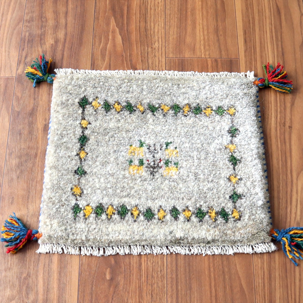 ギャッベ イラン産手織り 座布団サイズ 35×41cm ナチュラルアイボリー 生命の樹と動物