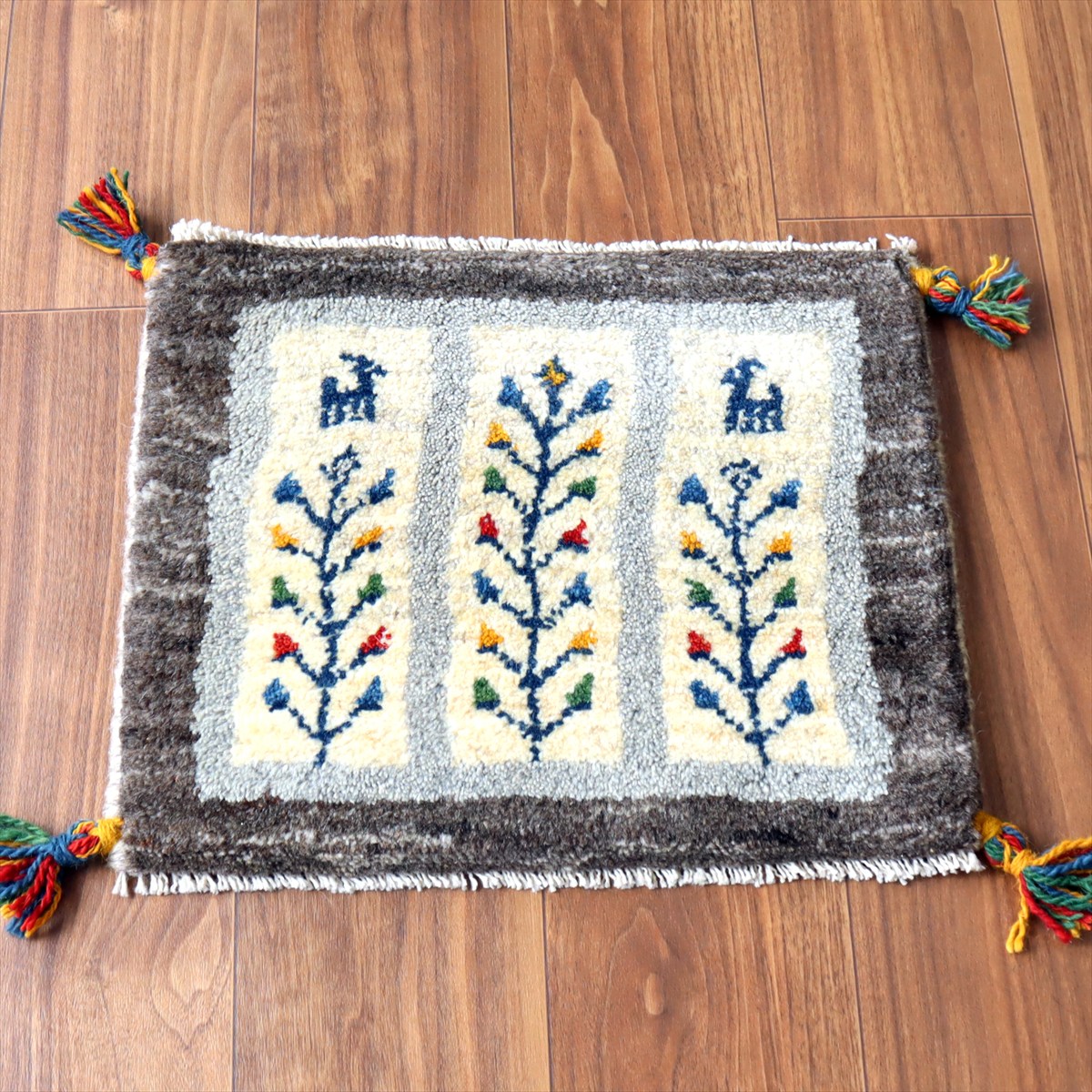 ギャッベ イラン産手織り 座布団サイズ 36×44cm ナチュラルアイボリー 生命の樹と動物