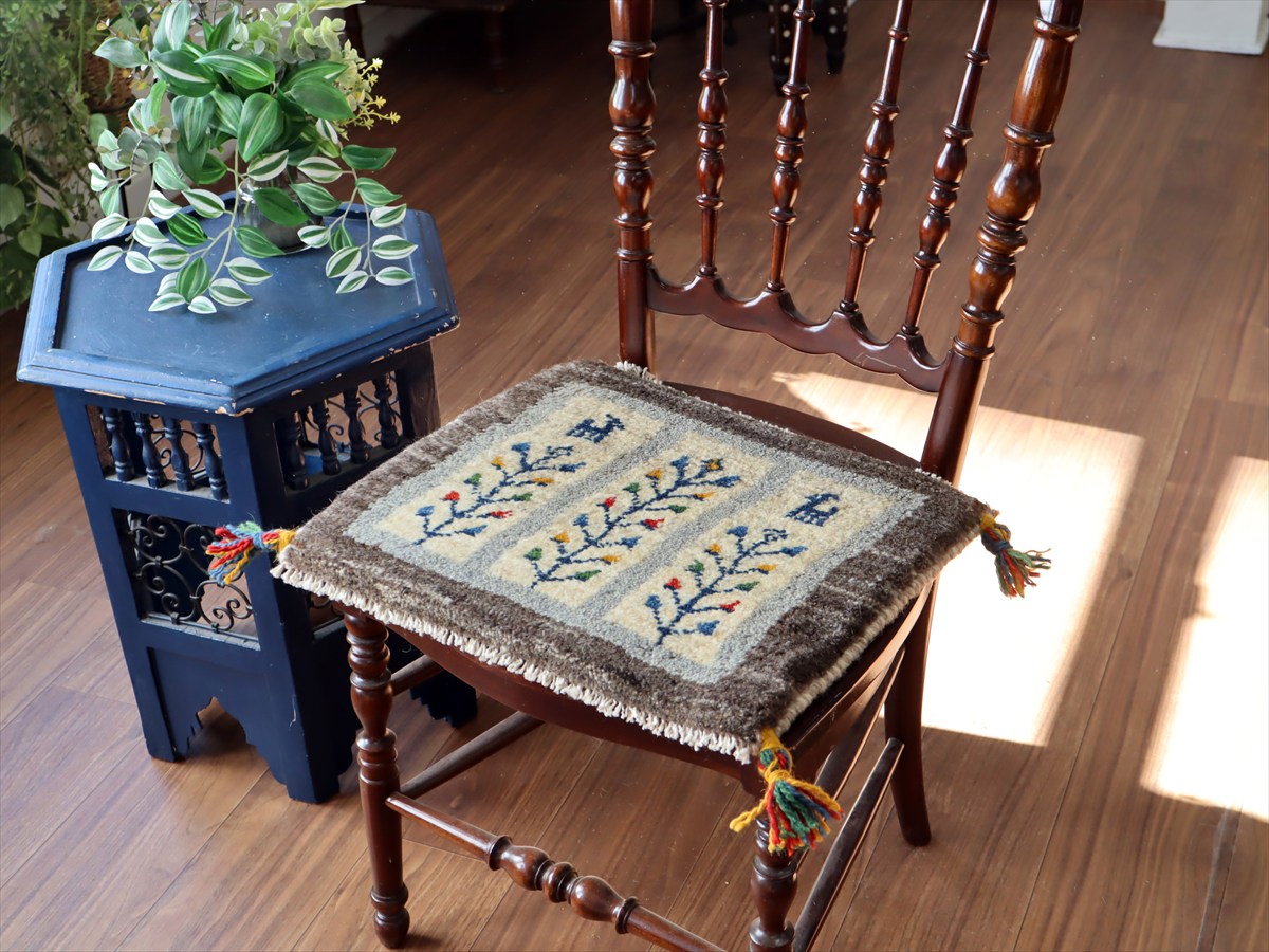 - ギャッベ イラン産手織り 座布団サイズ 36×44cm ナチュラルアイボリー 生命の樹と動物