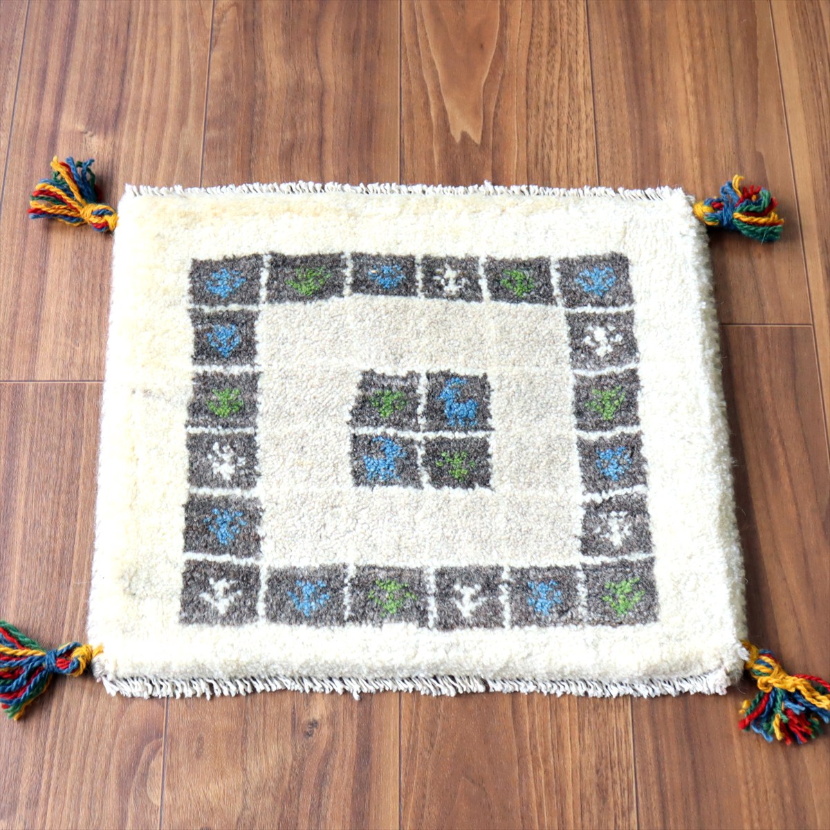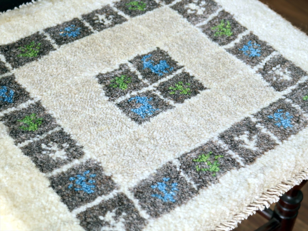 ギャッベ イラン産手織り 座布団サイズ 36×44cm ナチュラルアイボリー タイルの中に生命の樹と動物