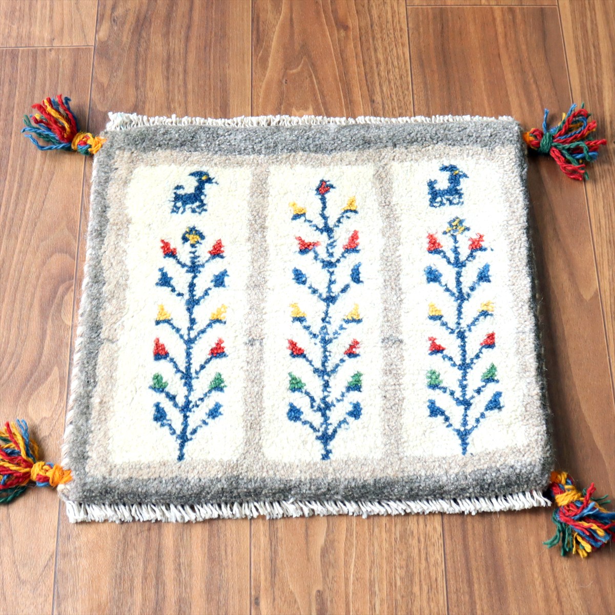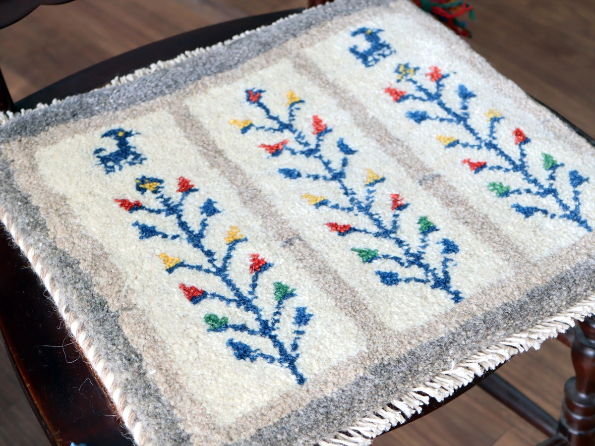 ギャッベ イラン産手織り 座布団サイズ 36×39cm ナチュラルアイボリー カラフルな連なる生命の樹と動物