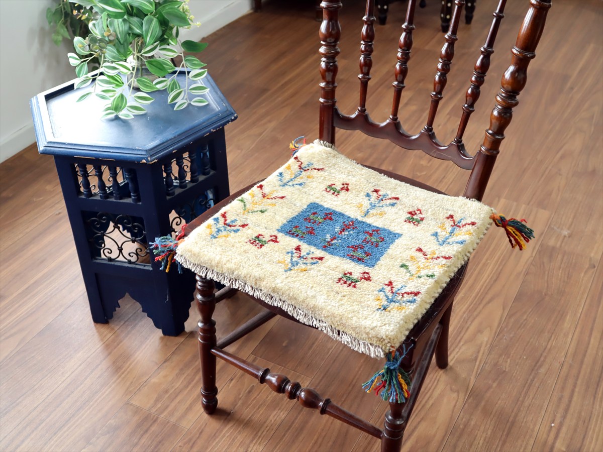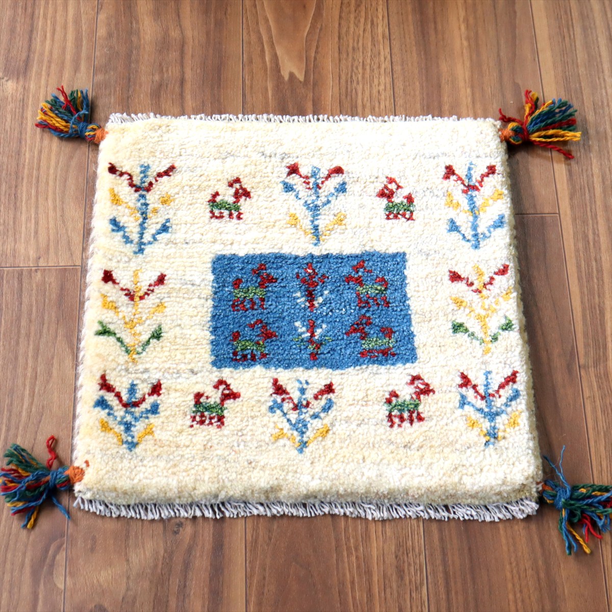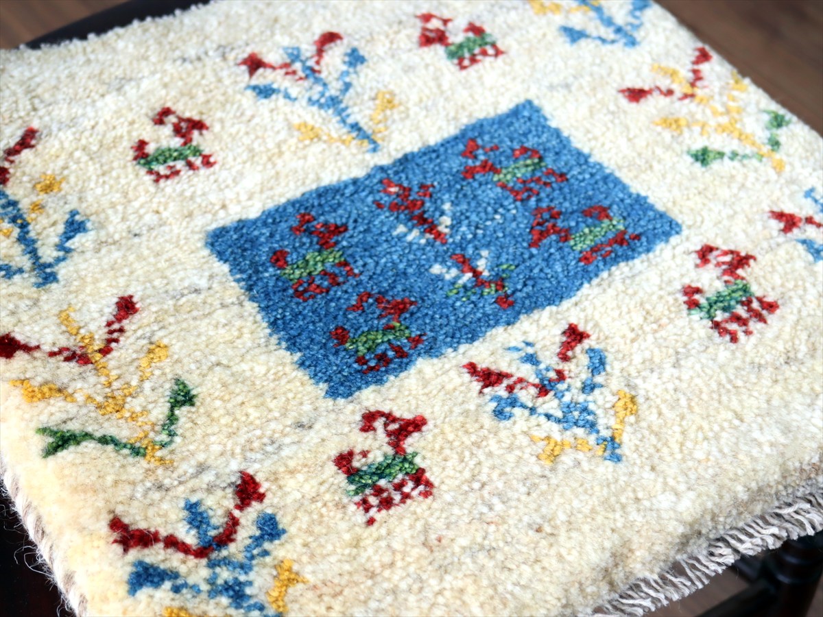 - ギャッベ イラン産手織り 座布団サイズ 38×40cm ナチュラルアイボリー カラフルな生命の樹と動物