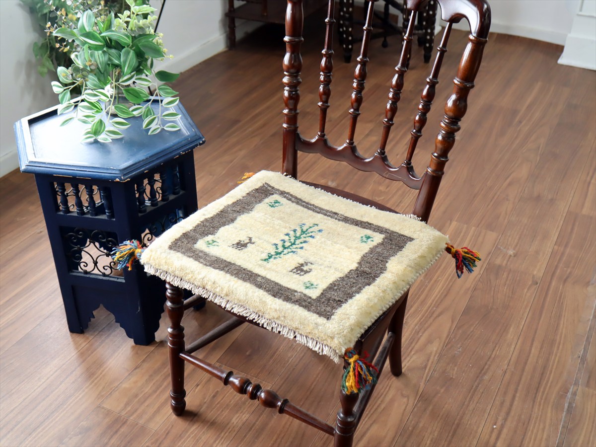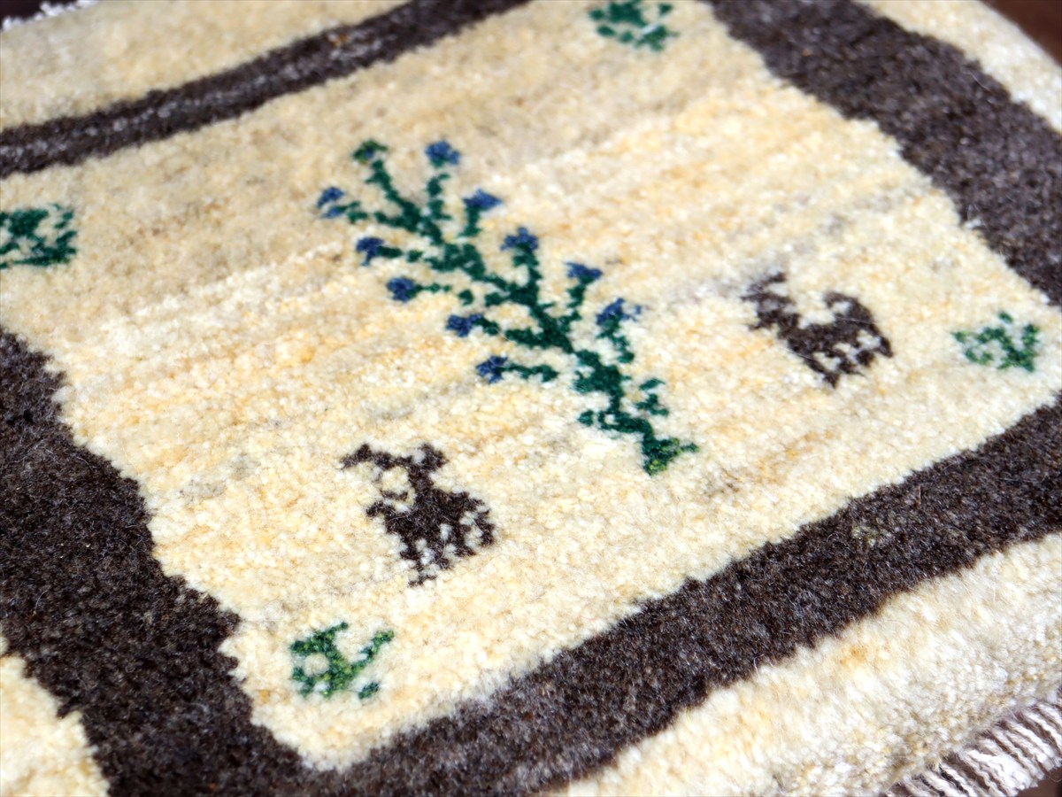 ギャッベ イラン産手織り 座布団サイズ 38×43cm ナチュラルアイボリー 生命の樹と動物