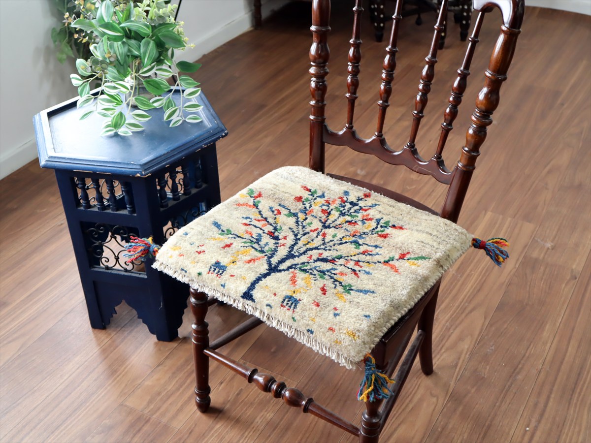- ギャッベ イラン産手織り 座布団サイズ 38×43cm ナチュラルアイボリー カラフルな花の咲いた生命の樹と動物