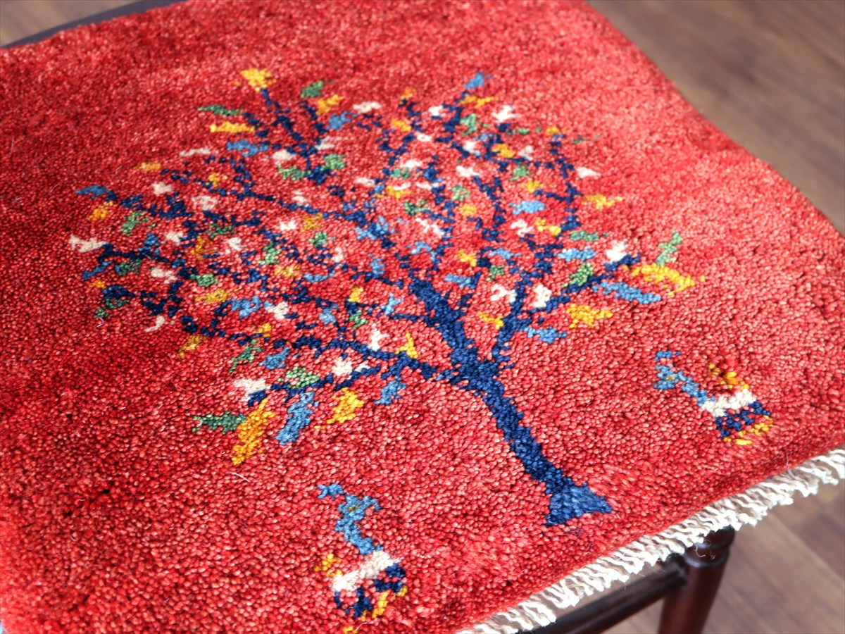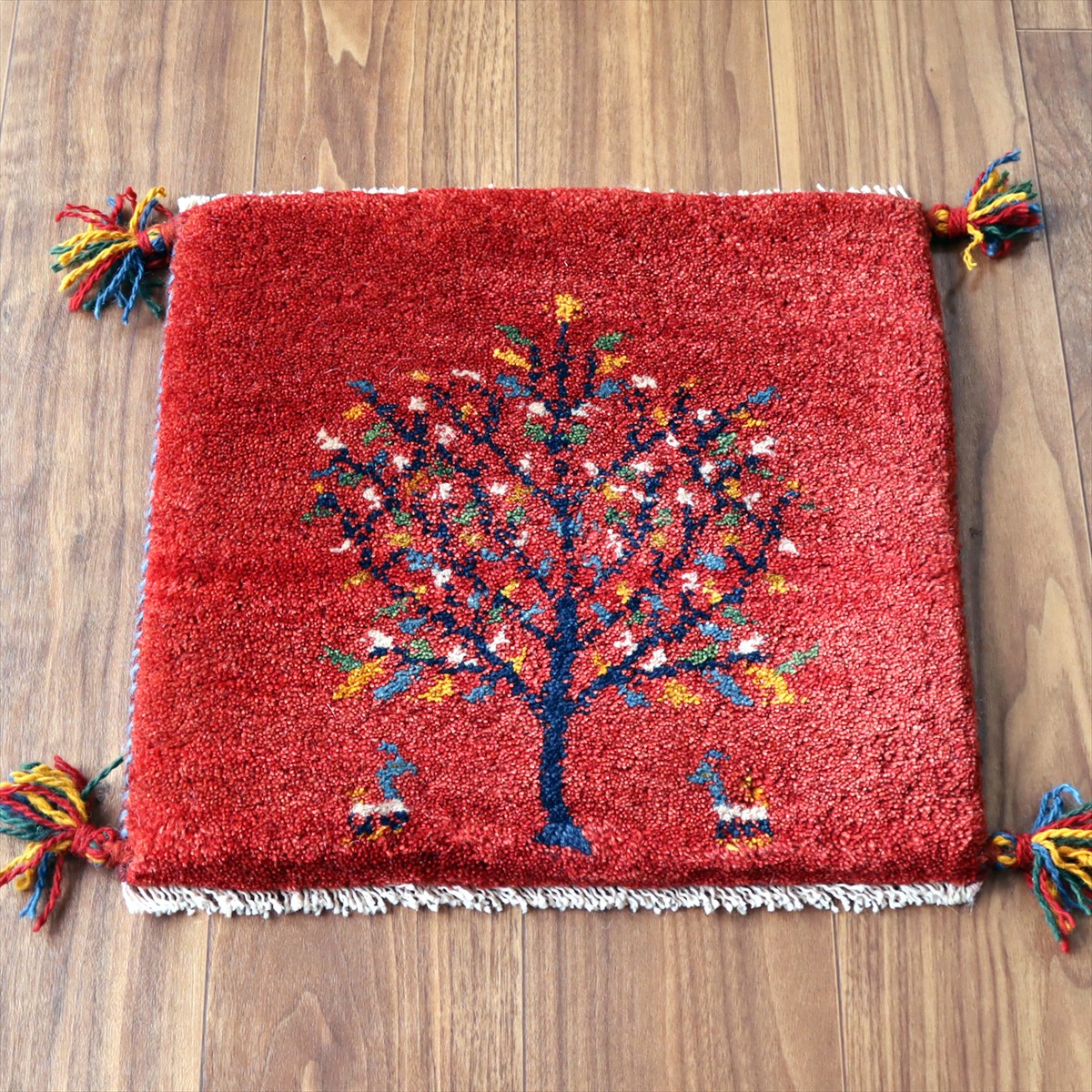 ギャッベ イラン産手織り 座布団サイズ 40×43cm レッド カラフルな花の咲いた樹と動物