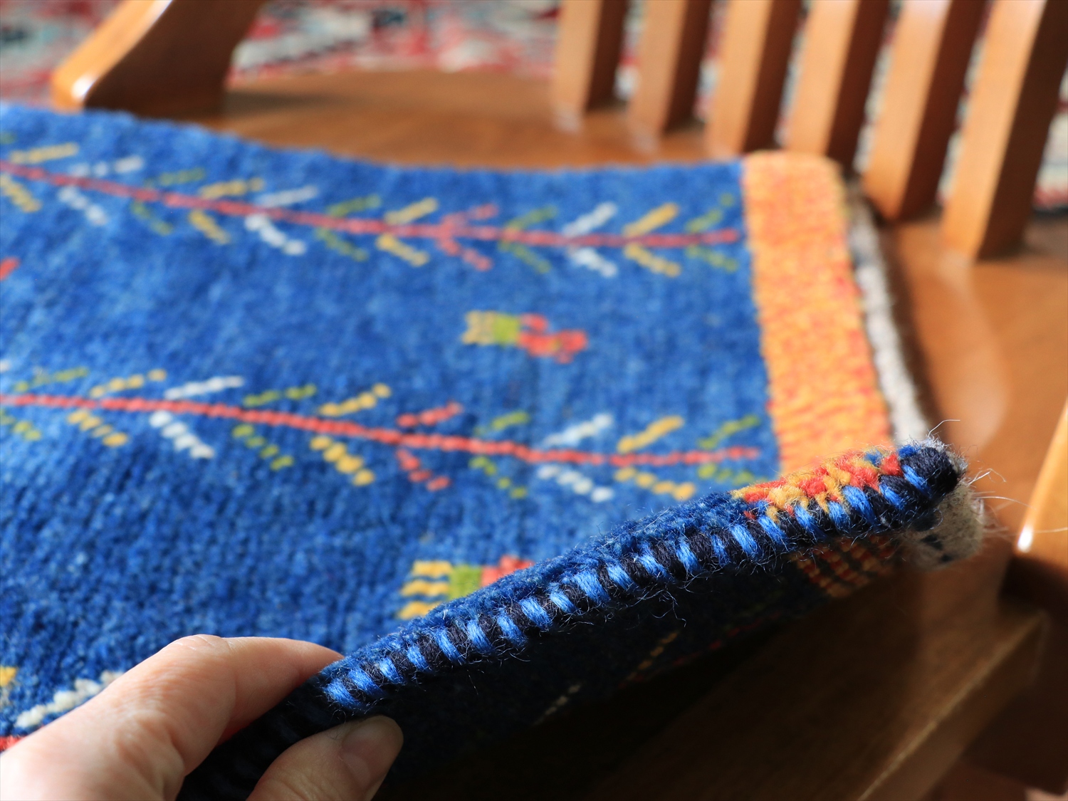 バザールギャッベと呼ばれるポンポンが4隅についたものと比べて、ウォッシング、シャーリング、縁の巻き加工などの最後のメンテナンスのクオリティは高いです。その為、遊び毛も出にくく、繊細なモチーフが表現されています。