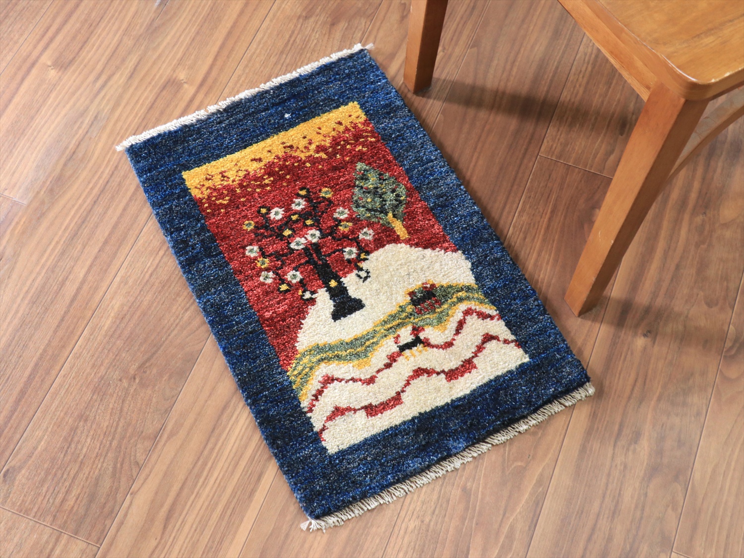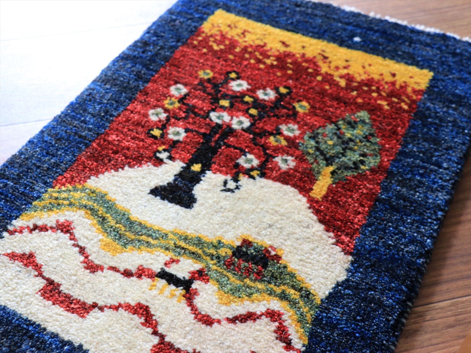 花咲く生命の木が織り込まれた風景デザインのギャッベ。花札のようですね。