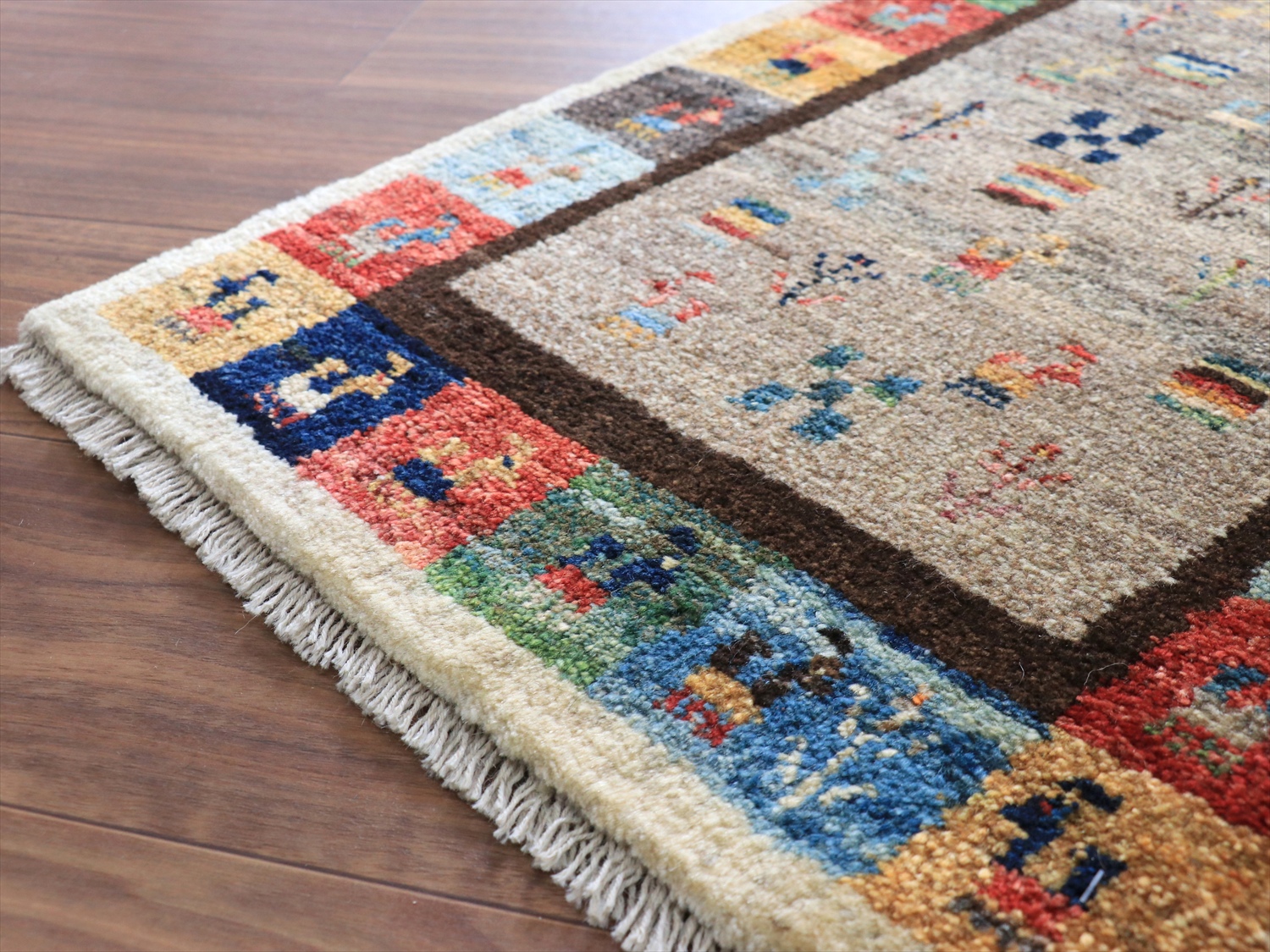 中央のベースの色は、染料を使わずに天然の羊毛の色をそのまま使ったグレー。ランダムは配置で、動物や草花のモチーフが並べられています。周囲のカラフルなタイルモチーフもひとつひとつがかわいらしく、素朴なギャッベのイメージそのままのデザインです。