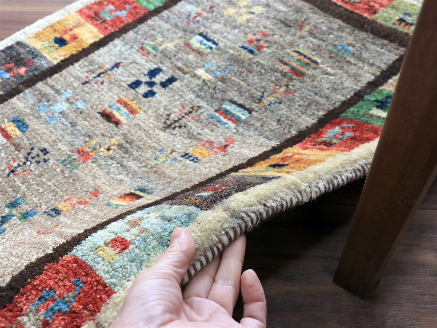 ぎゅっと引き締まって、厚みのある織り。パイル(毛足)を含めたギャッベの厚みは1.6-1.7cmでボリューム感があります。