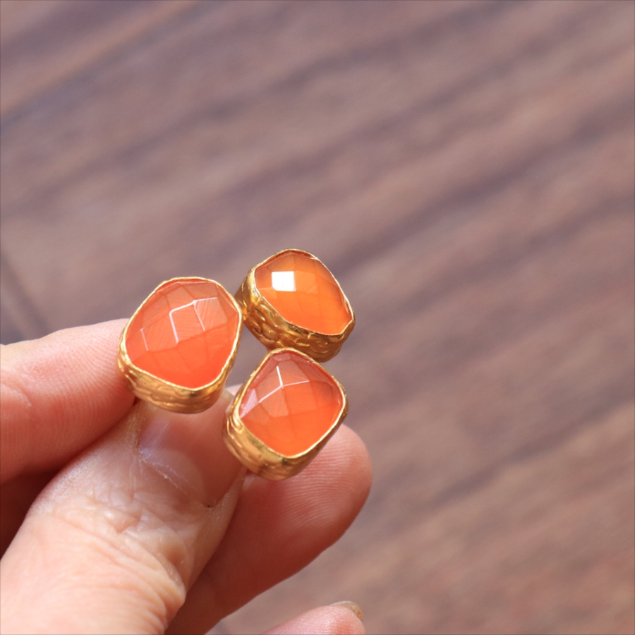 半透明のオレンジ色がきれいなカーネリアン3粒のリングです。カーネリアンは不純物もほとんどなく均一な色で、それだけに3つの石の形がひとつひとつ際立って見えます。それぞれの石にぴったりの枠を作る職人さんの丁寧な仕事が光る逸品です。
