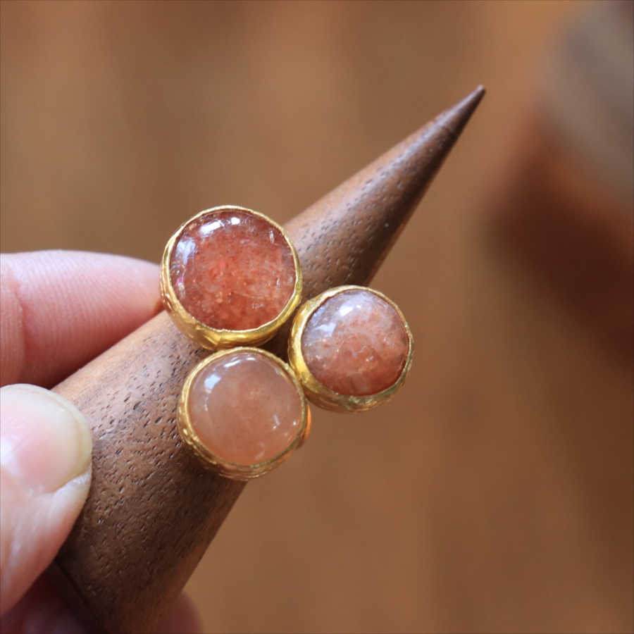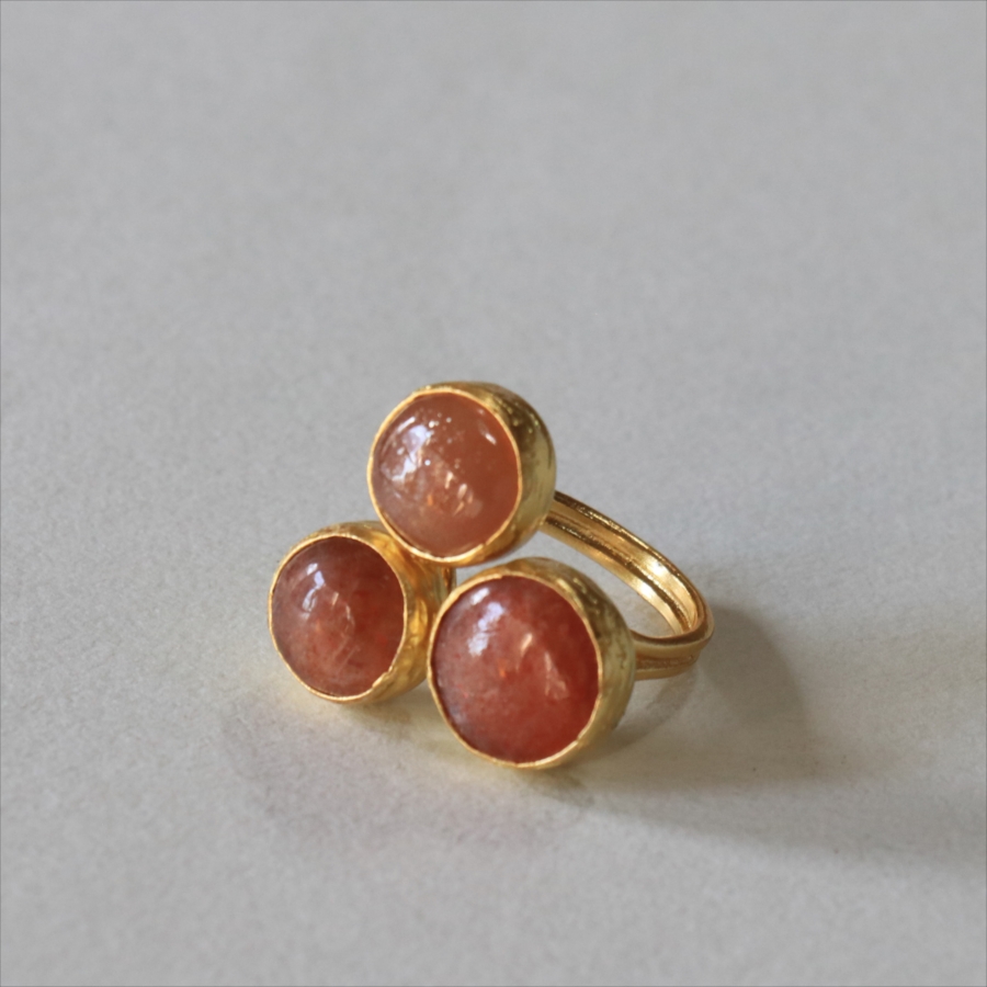 ほんのりブラウンがかったレンガの石の中に、よく見るときらきらと輝くインクルージョンがちりばめられたサンストーンが三つ並んだリング。コロンと丸形の3つの石はそれぞれ個性があり、ラメの様な輝きが光の射す角度によってきらめきます。