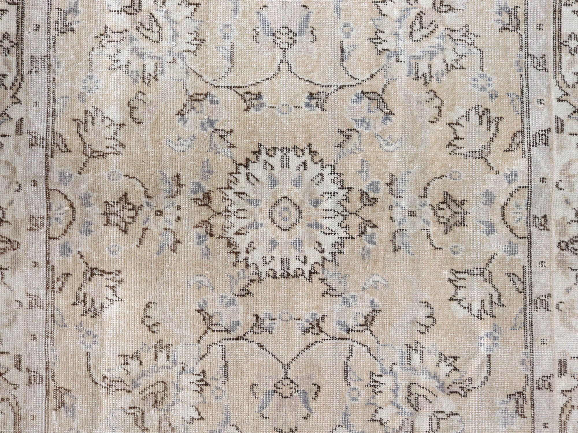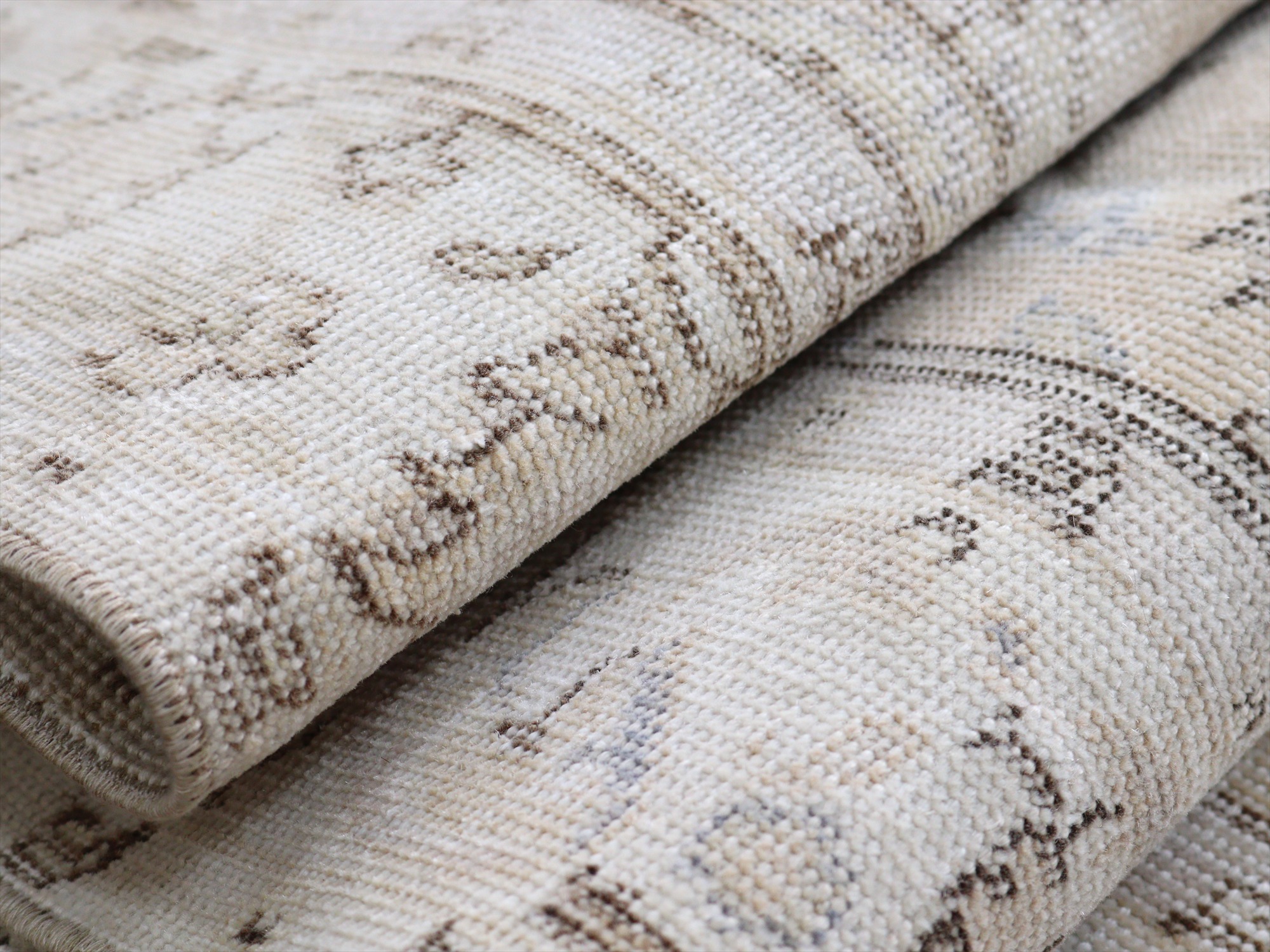 もともとユーズドラグをリサイクルしていますので、全体的に古びた印象に加工してあります。じゅうたん自体はしっかりしていますので、まだまだこれからもお使いいただけます。ベースを含めたラグの厚みは5-6mm前後で、全体的にパイル(毛足)は短く、結び目が見えています。このラグはブリーチのみで、上から別の色に染めてはいないようです。