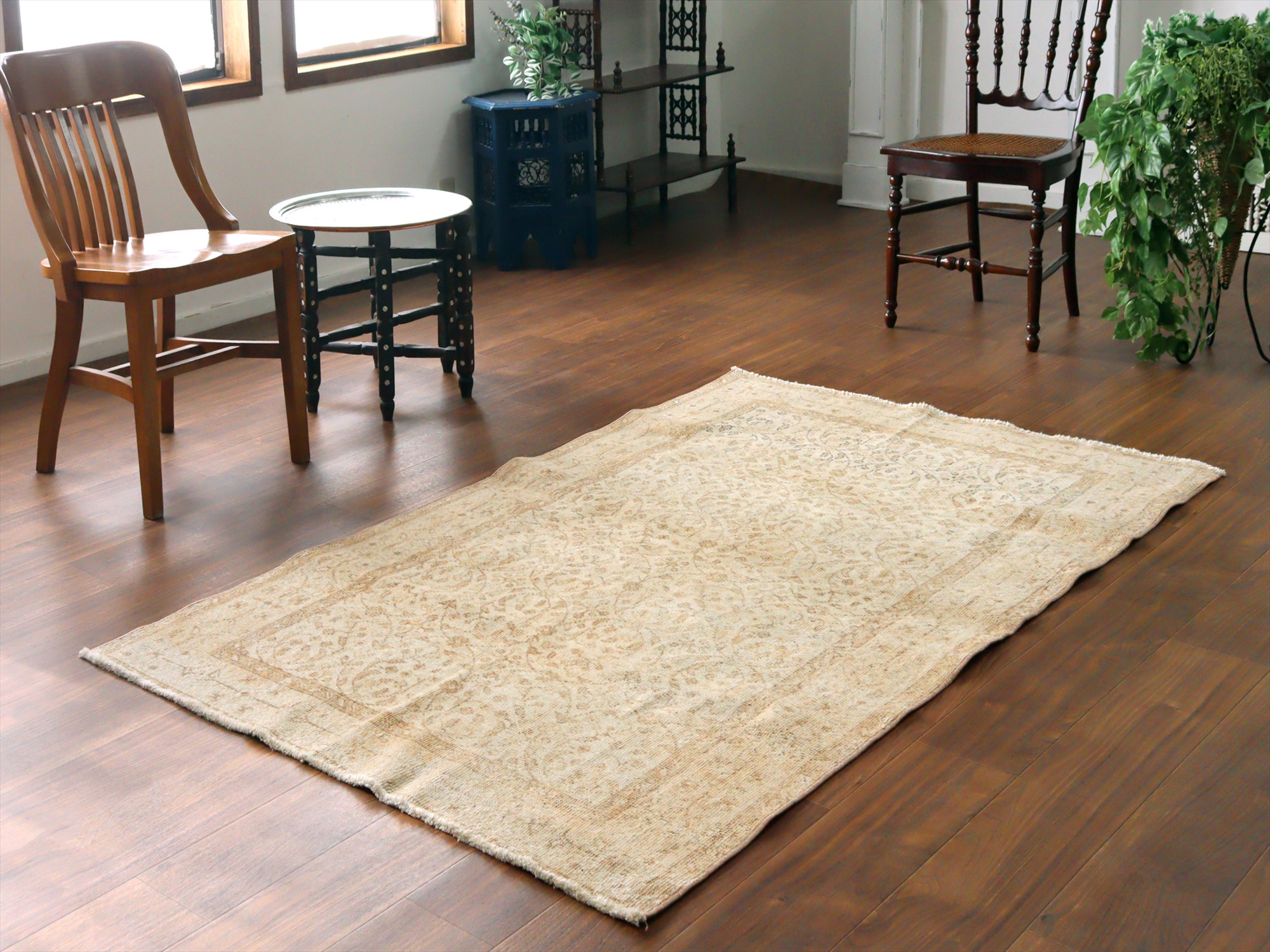 ダメージが多く、使われなくなった古い手織りカーペットを、洗った上でブリーチをかけてあります。色褪せた中にもオリジナルのデザインが薄く見えて、ヴィンテージ感のある仕上がりです。オリジナルの絨毯は、トルコ中央部の都市カイセリ地方の伝統柄です。