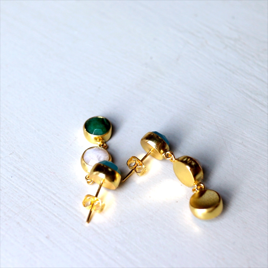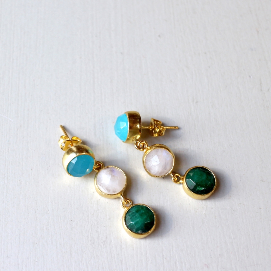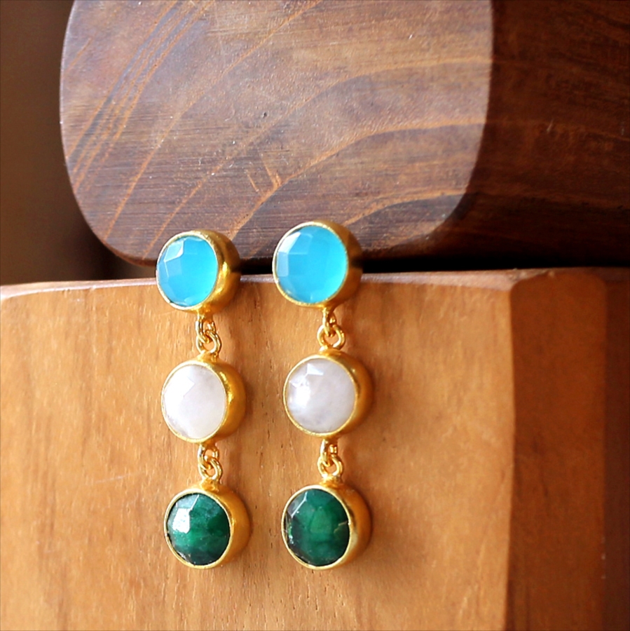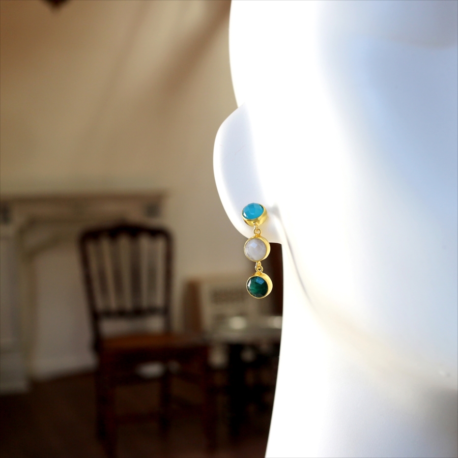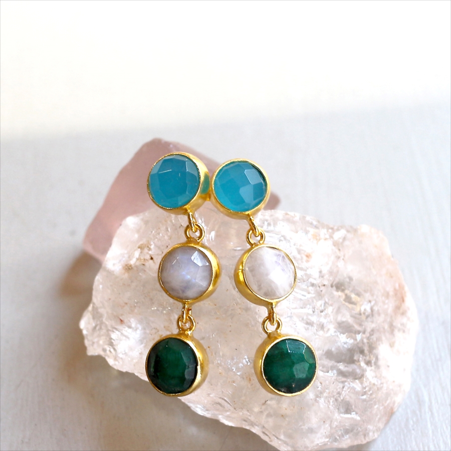 ブルーカルセドニー、ホワイトカルセドニー、エメラルド、異なる3色の天然石を縦に連ねたデザインは、動くたびに上品な揺れ感を生み、顔まわりを華やかに演出します。
