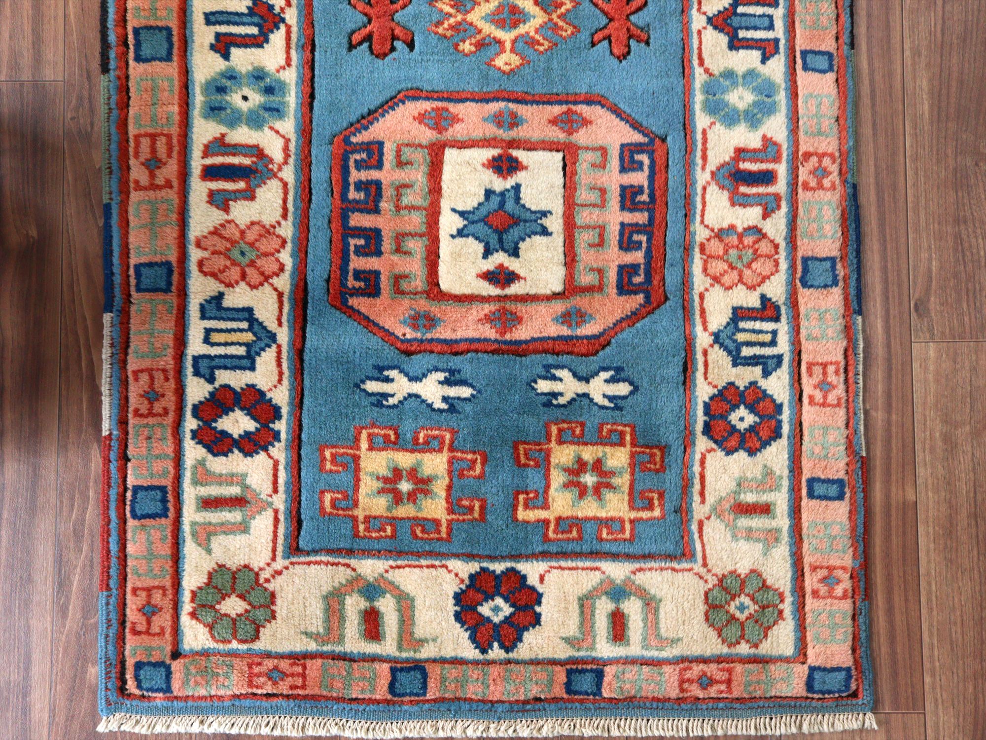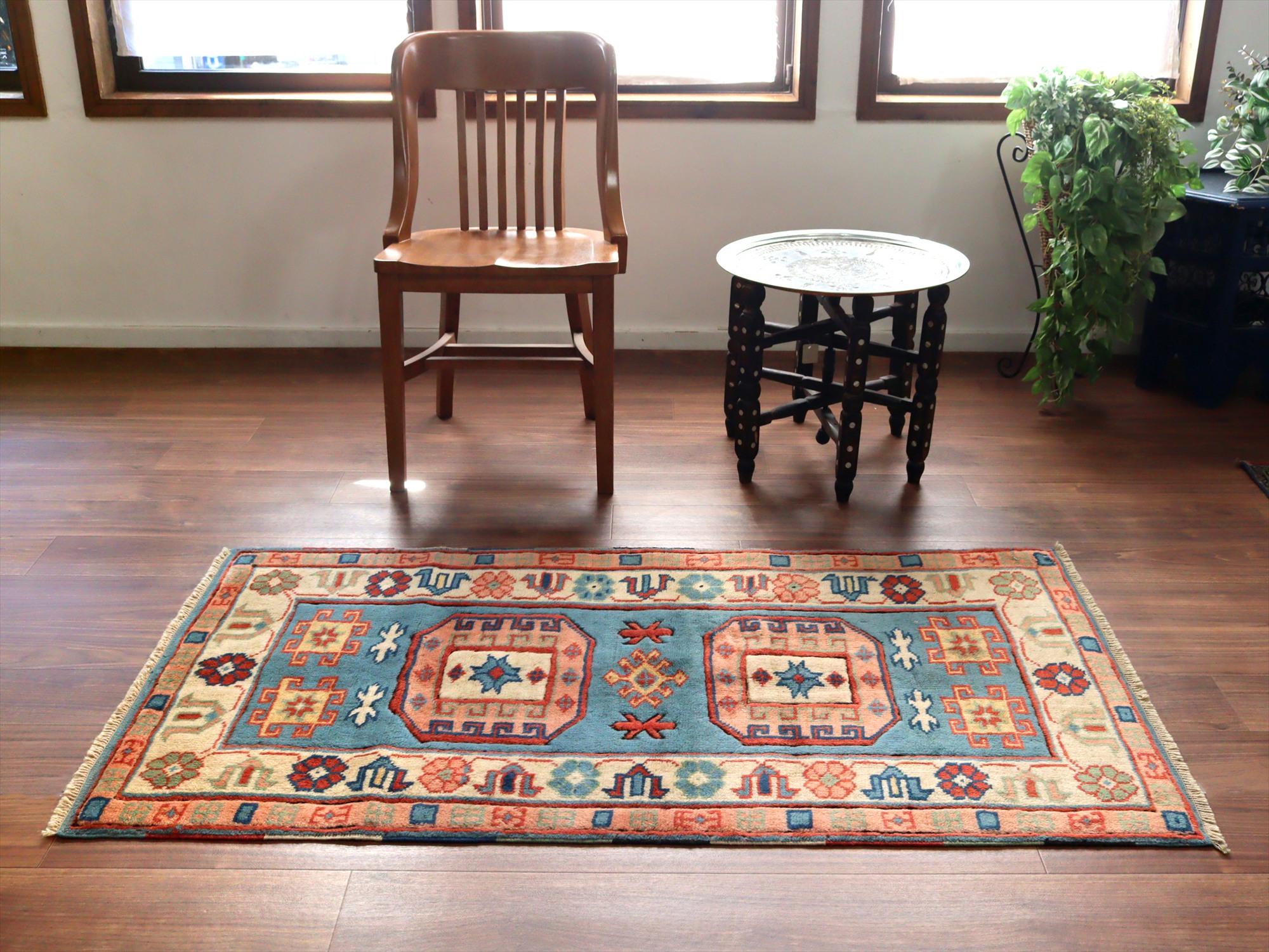 - トルコの手織り絨毯 チャナッカレ148×82cm 幾何学モチーフと小花