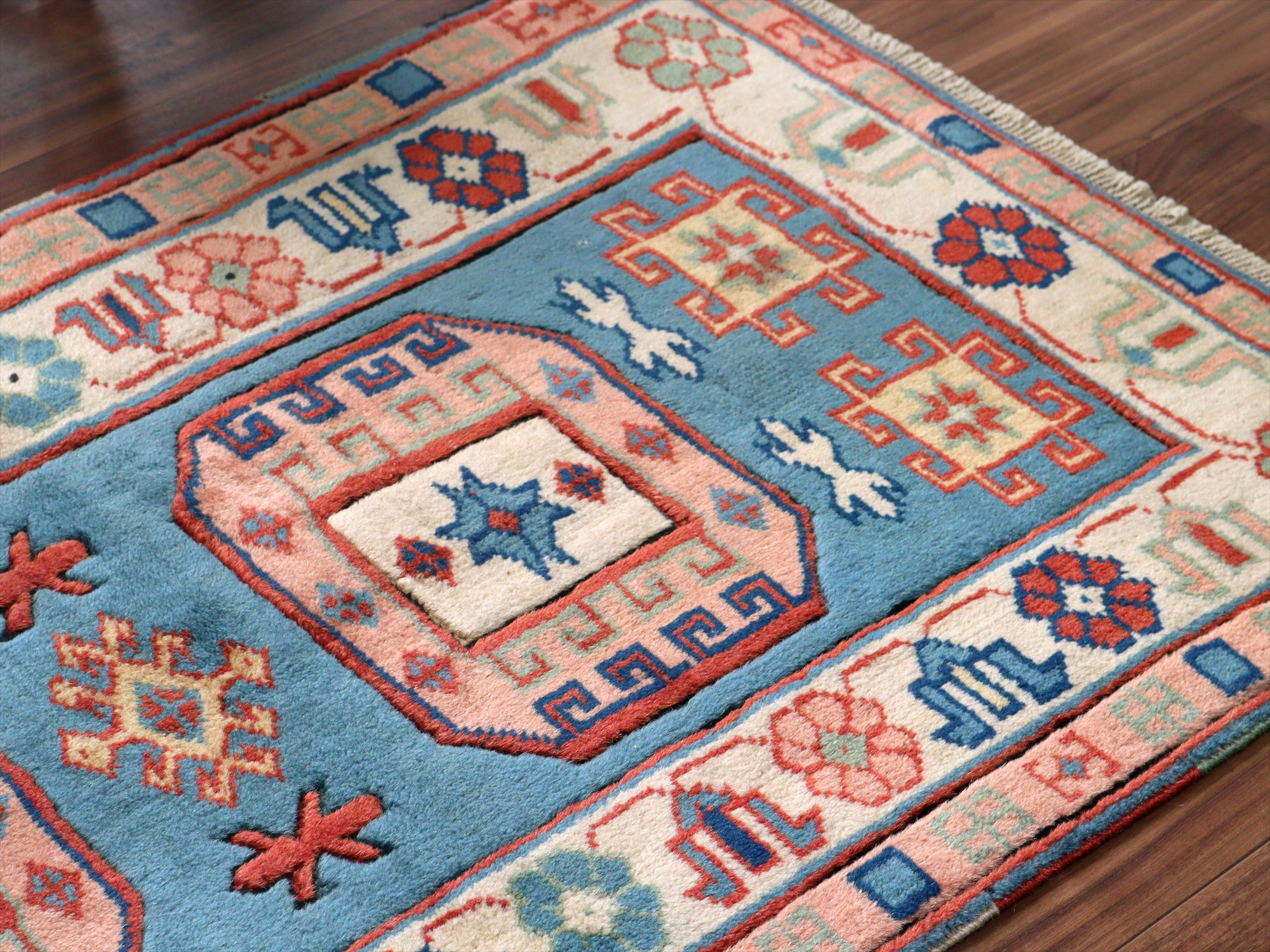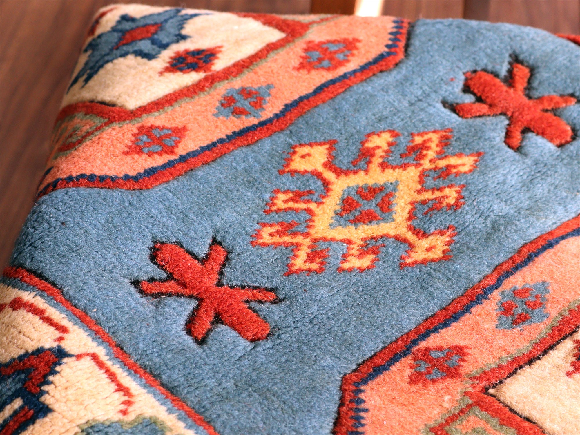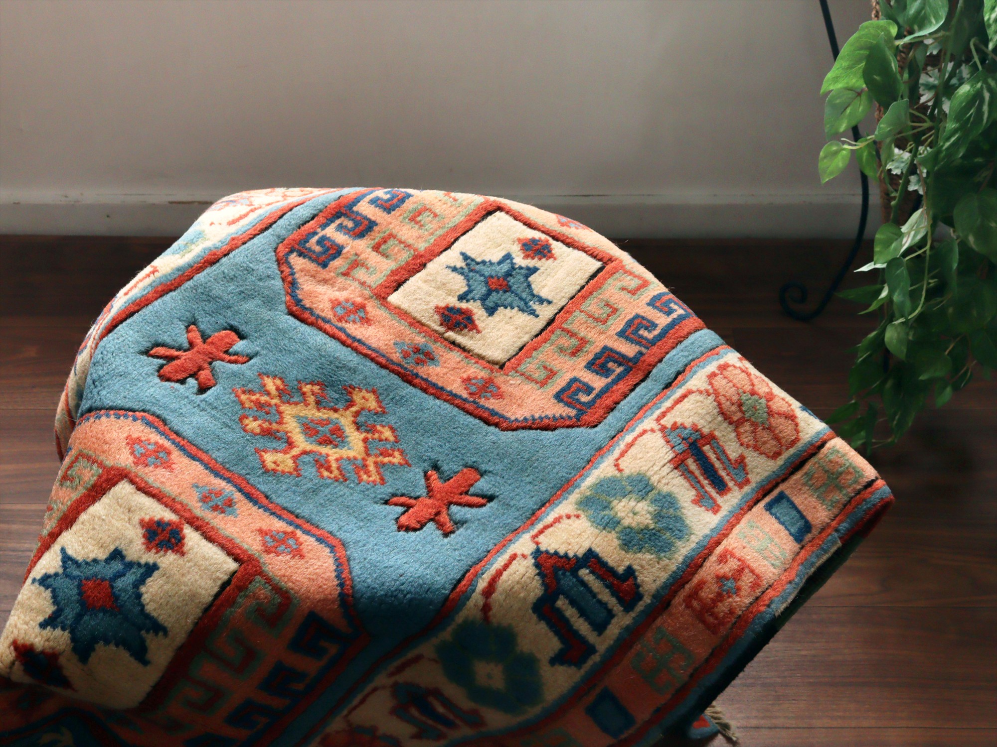トルコの北西部に位置する港町、チャナッカレで織られた絨毯。大柄のモチーフ、またピンクがかった朱色、ブルー、グリーン、水色など明るい色使いで全体的にかわいらしい印象です。横幅が抑えられていて、やや細長いサイズ感で、アクセント使いにもちょうど良さそうです。