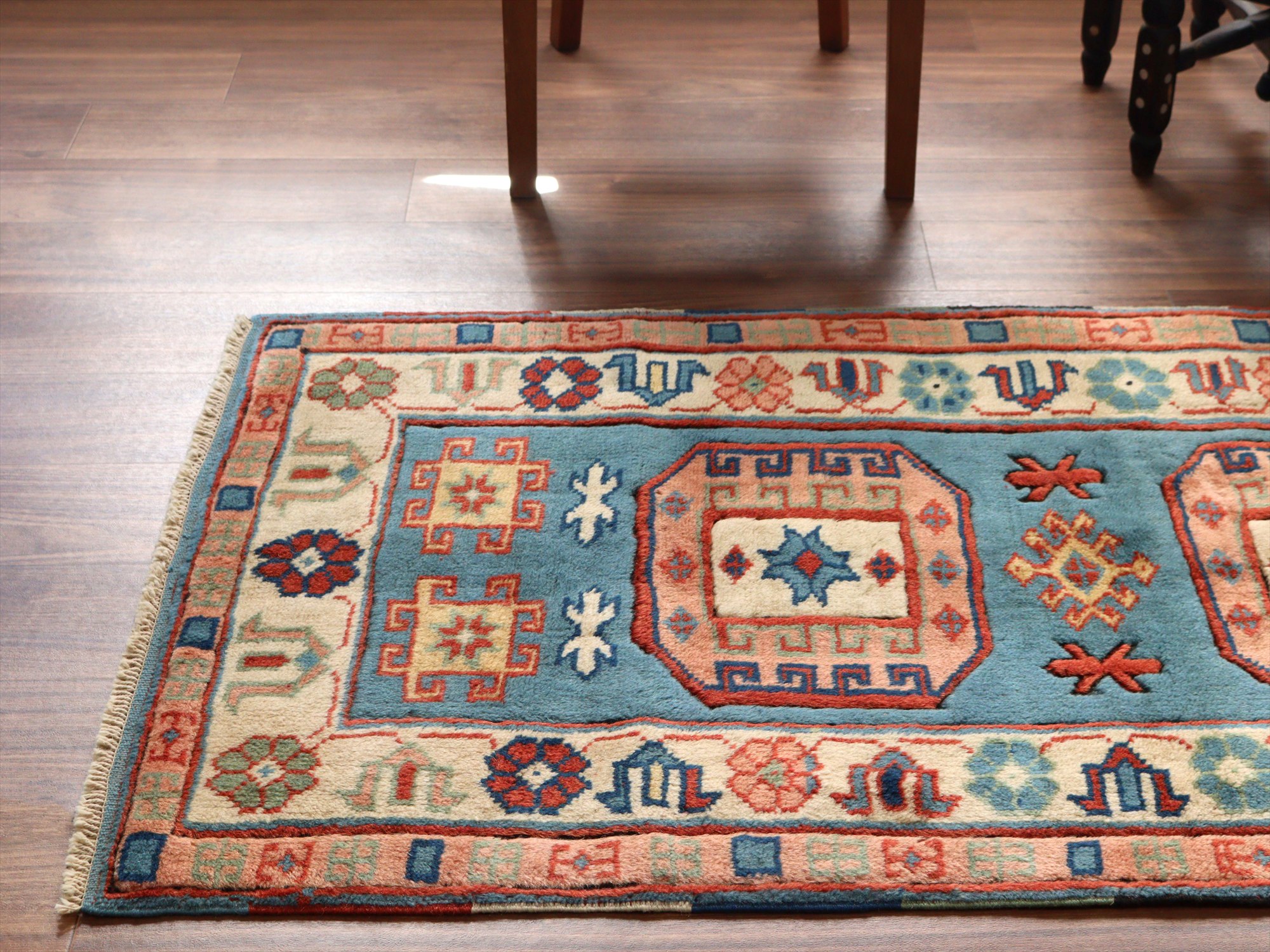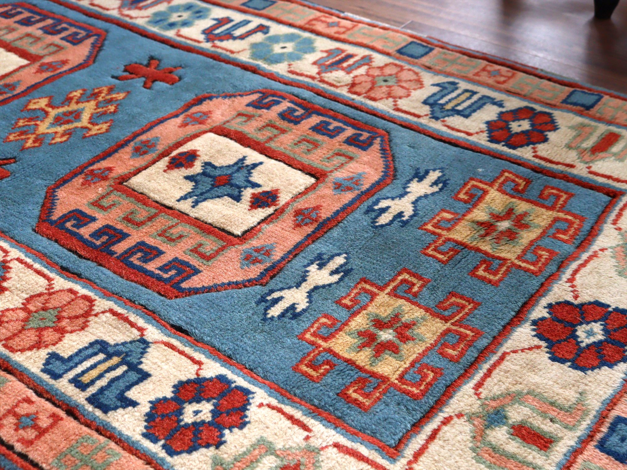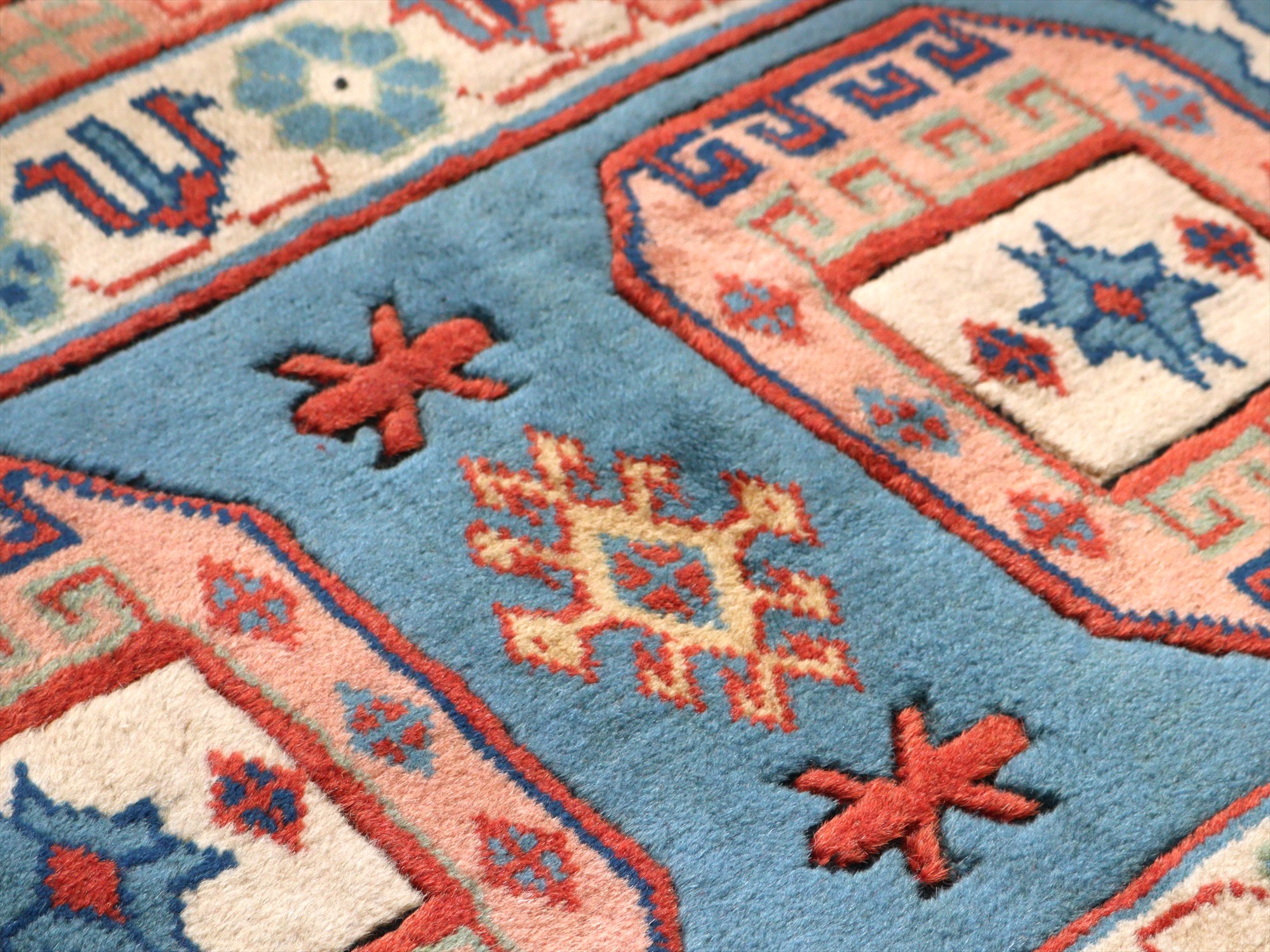トルコの北西部に位置する港町、チャナッカレで織られた絨毯。大柄のモチーフ、またピンクがかった朱色、ブルー、グリーン、水色など明るい色使いで全体的にかわいらしい印象です。横幅が抑えられていて、やや細長いサイズ感で、アクセント使いにもちょうど良さそうです。