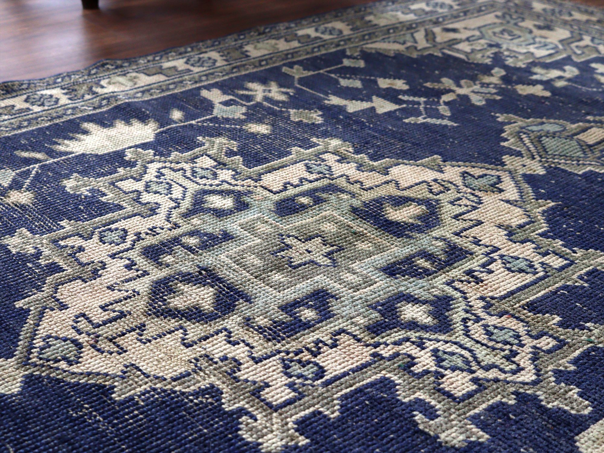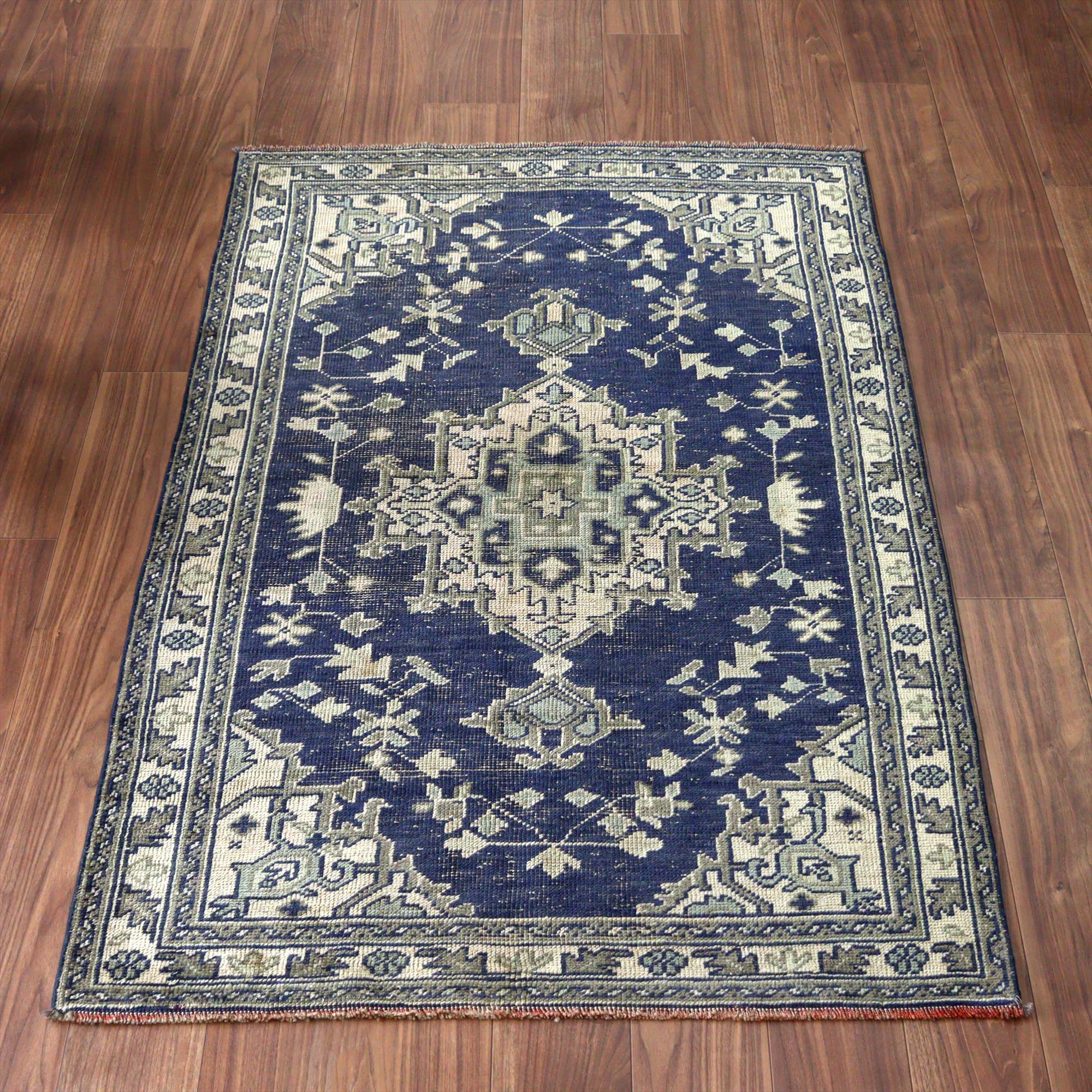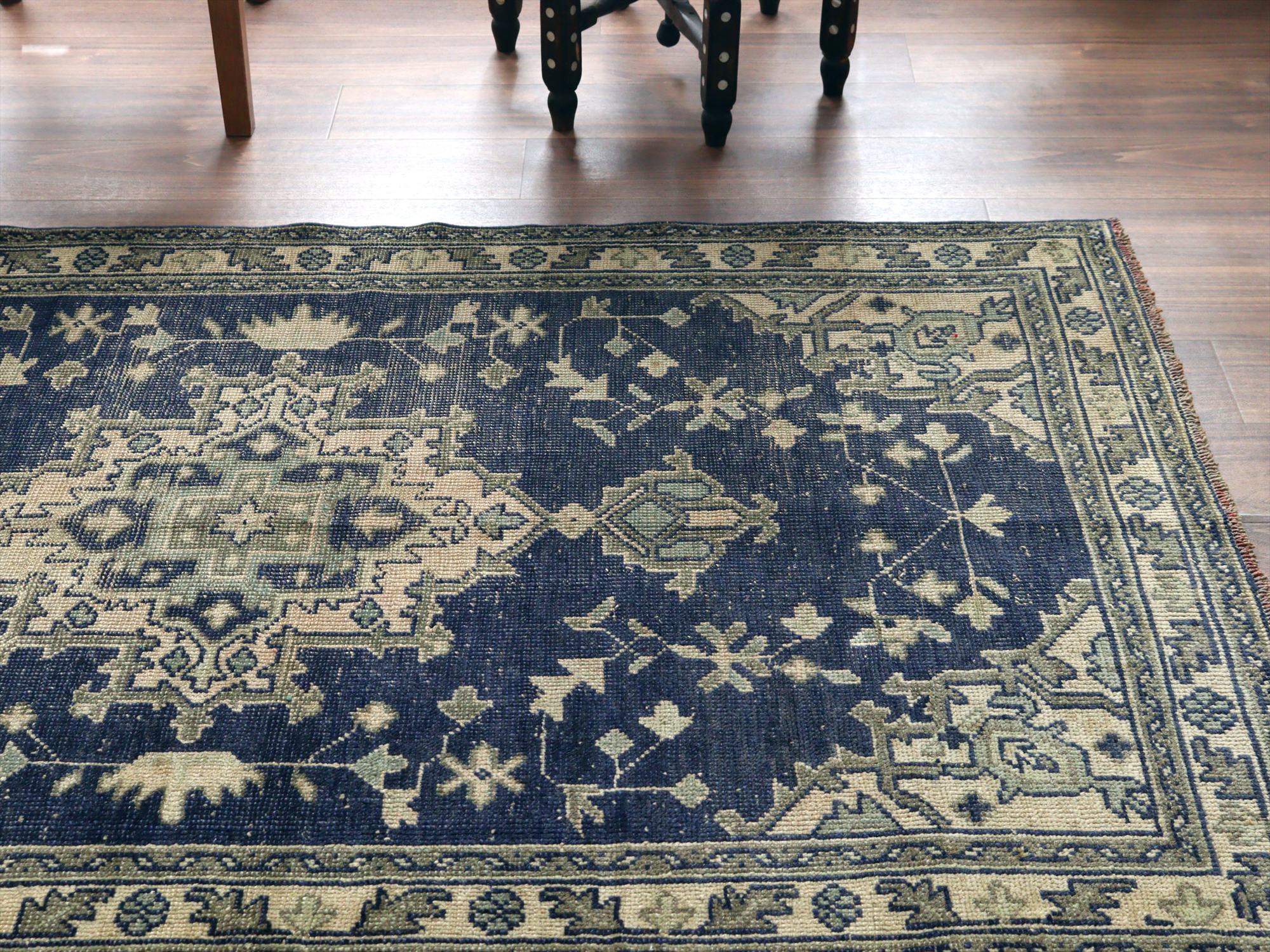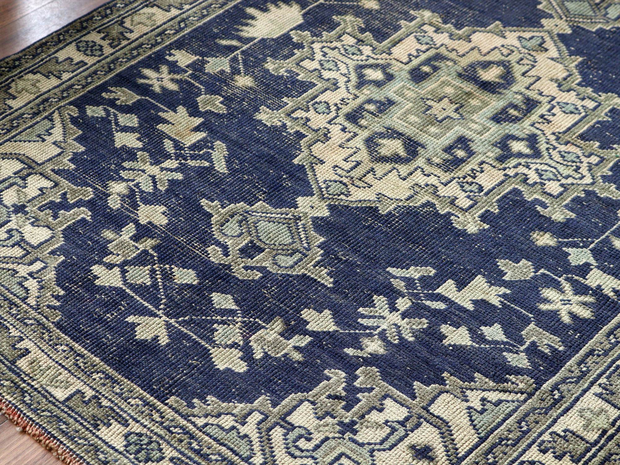 ネイビーを基調としたウシャク地方の絨毯で中央にメダリオン、そのまわりには幾何学モチーフが規則正しく織られています。ネイビーを除いた部分には、別の染料で染めた色糸が使われていたと思われますが、ほとんど色を残しておらず、恐らくブリーチ加工等を施したものと考えられます。