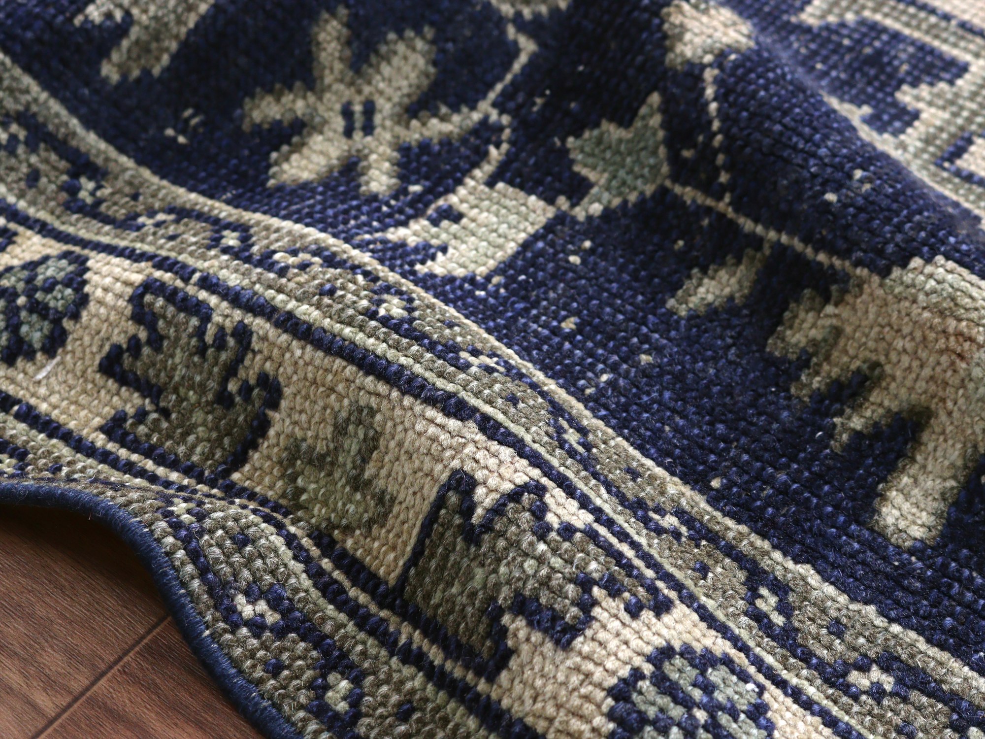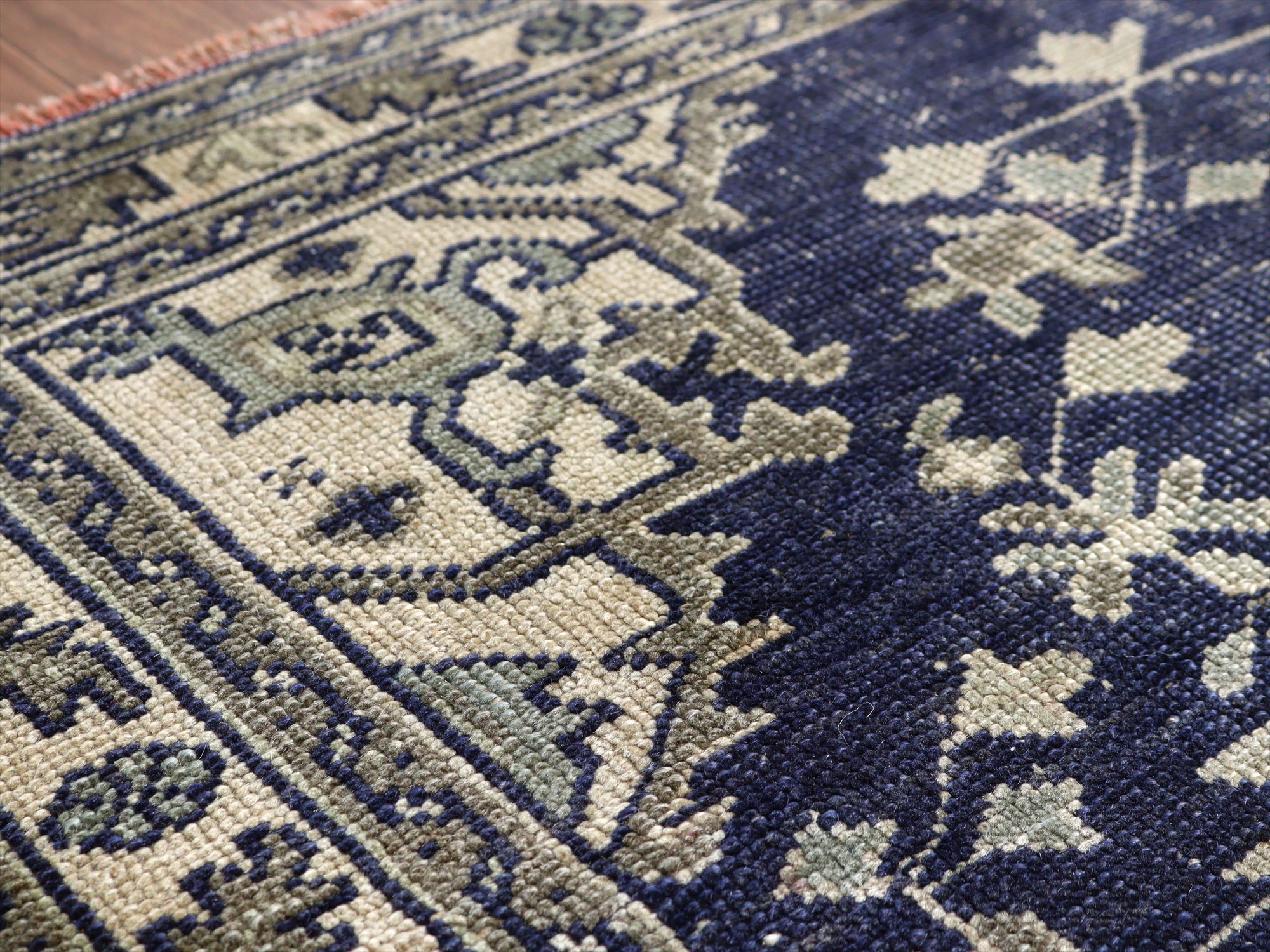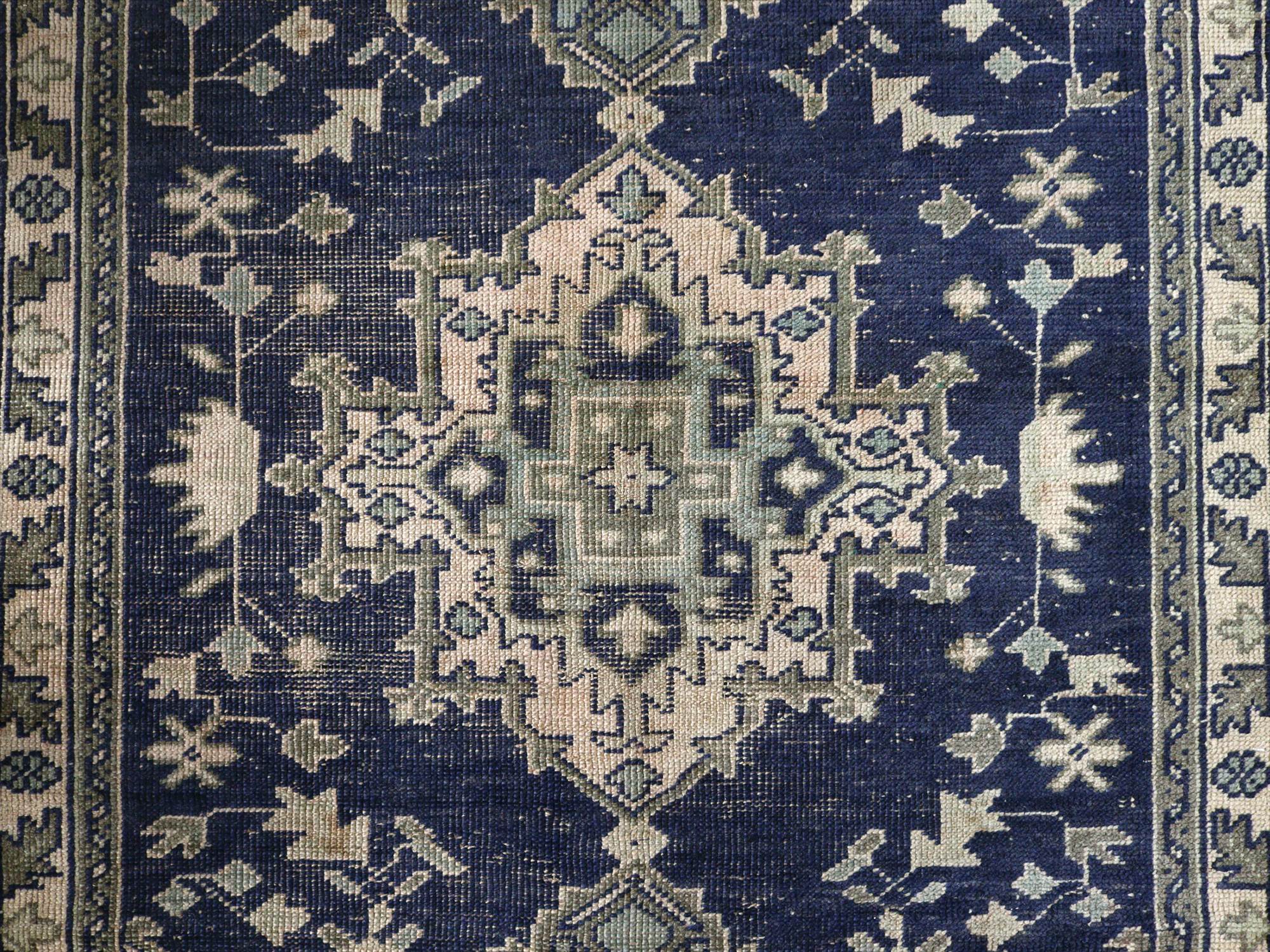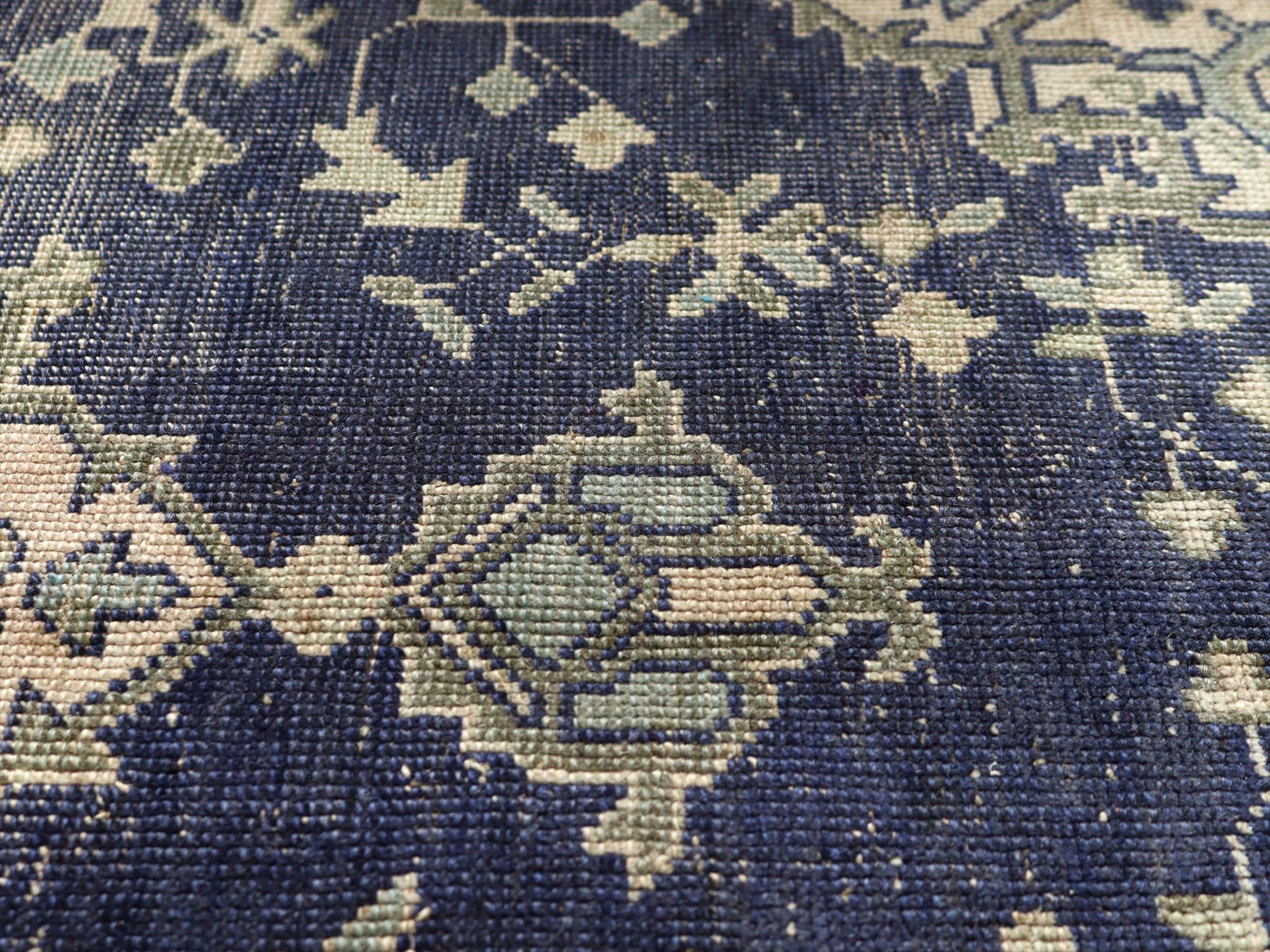 ネイビーを基調としたウシャク地方の絨毯で中央にメダリオン、そのまわりには幾何学モチーフが規則正しく織られています。ネイビーを除いた部分には、別の染料で染めた色糸が使われていたと思われますが、ほとんど色を残しておらず、恐らくブリーチ加工等を施したものと考えられます。