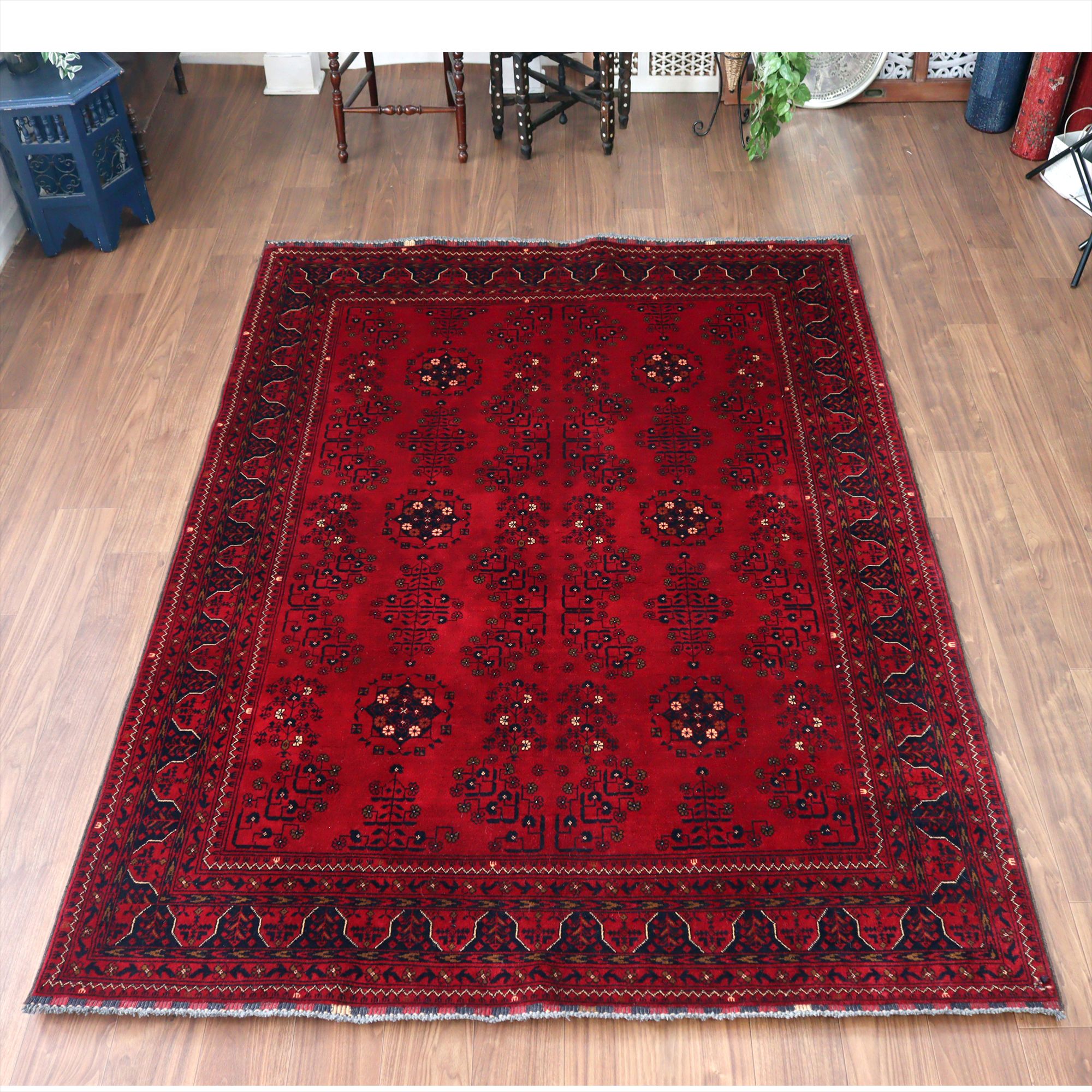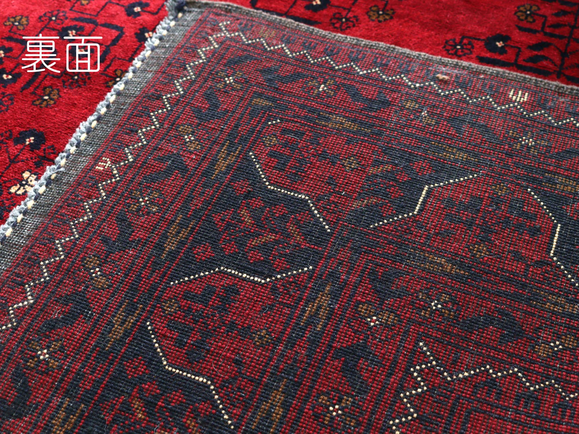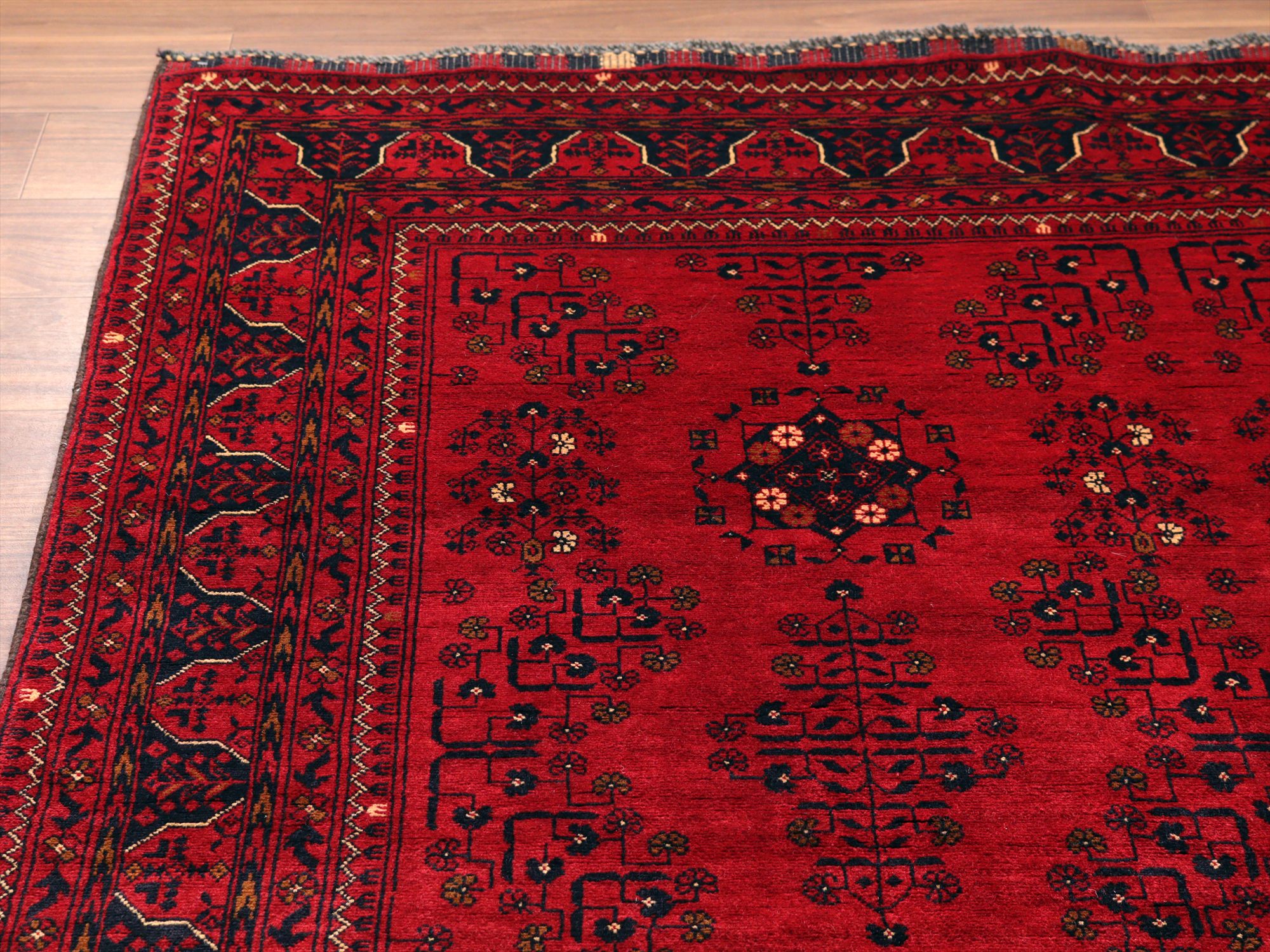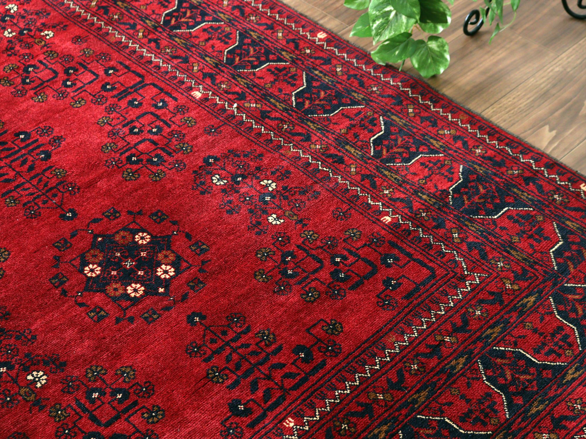 深い赤がどっしりとした重厚感を演出するアフガニスタン北部のクンドゥズ地方で織られた高級絨毯です。モチーフが細かいところまできれいに表現されていて、まさに洗練された1枚と言えるでしょう。