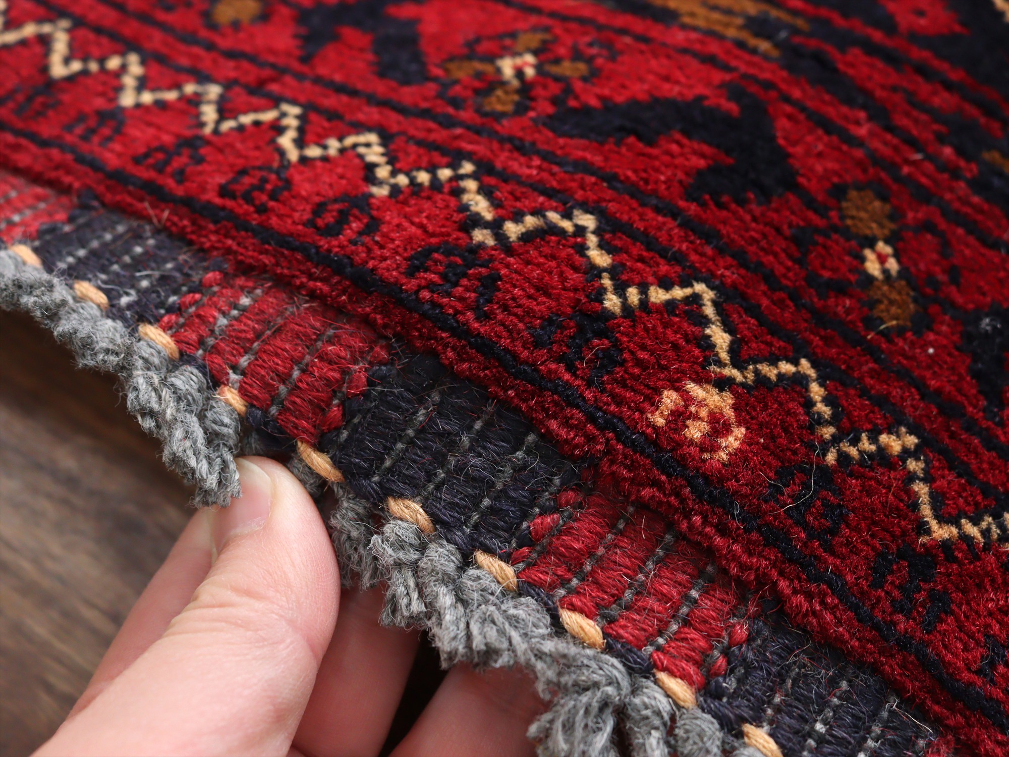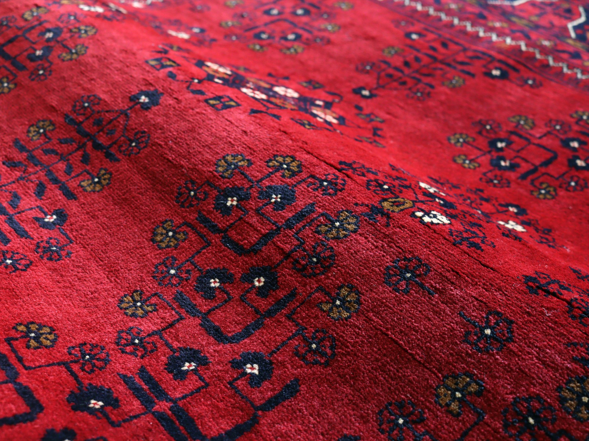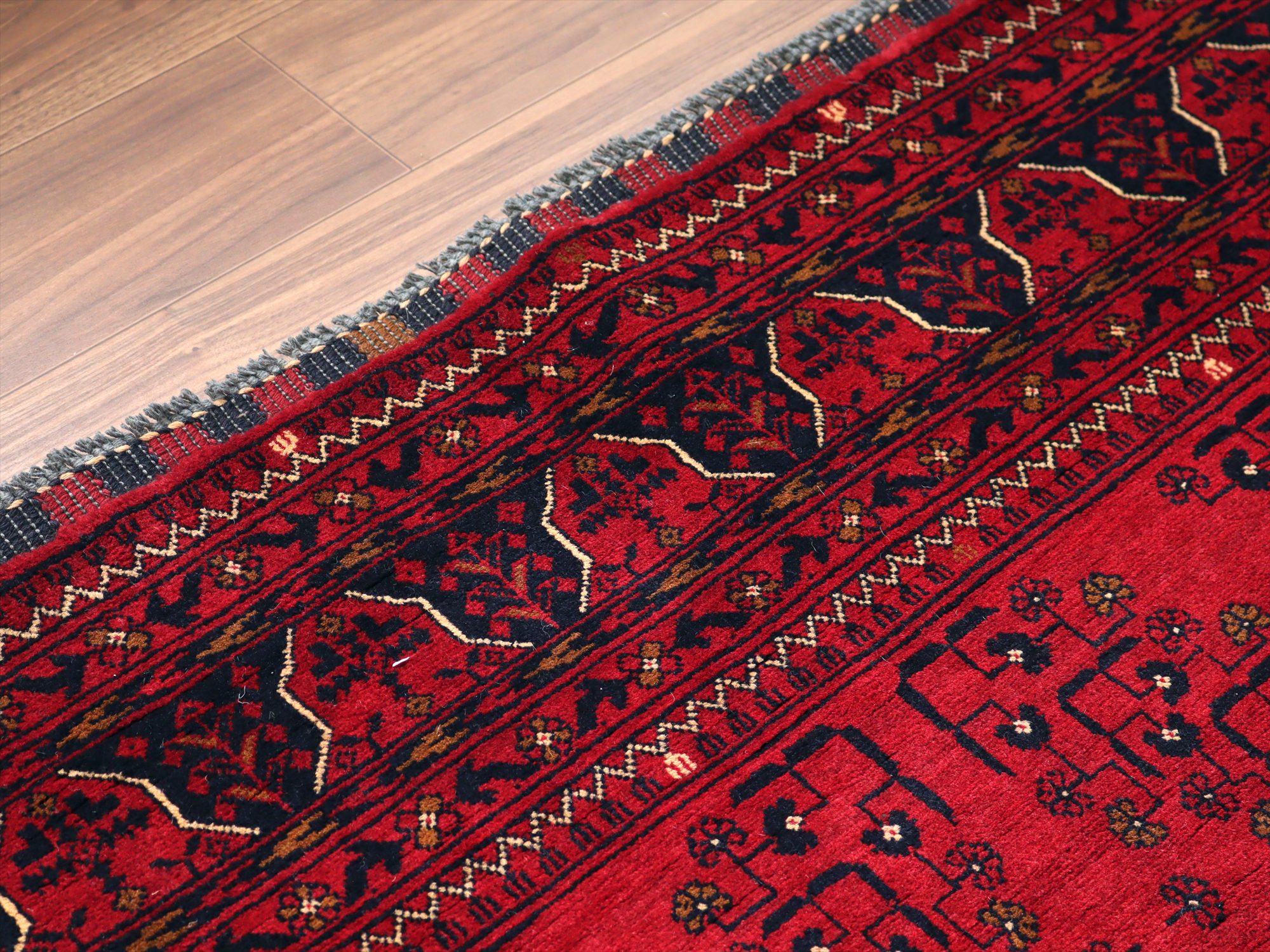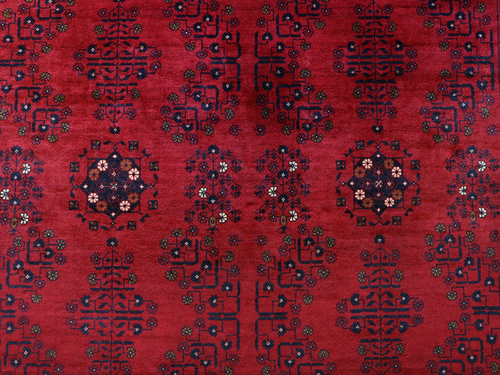 深い赤がどっしりとした重厚感を演出するアフガニスタン北部のクンドゥズ地方で織られた高級絨毯です。モチーフが細かいところまできれいに表現されていて、まさに洗練された1枚と言えるでしょう。