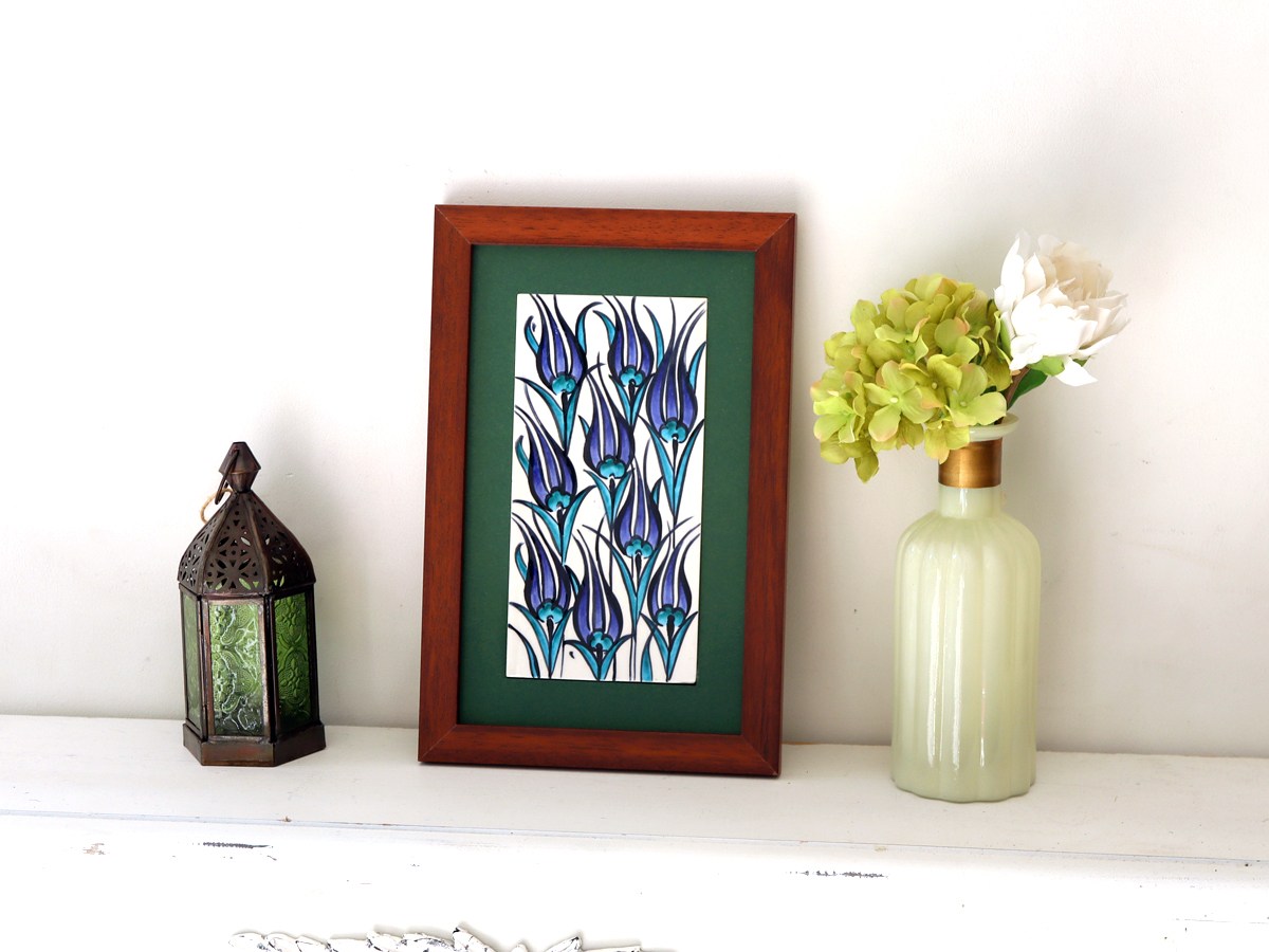 手書きタイル トルコ陶器 ミニタイル1枚額 H29×W19×D1.5cm ブルーチューリップ Turkish Hand Paint Tile
