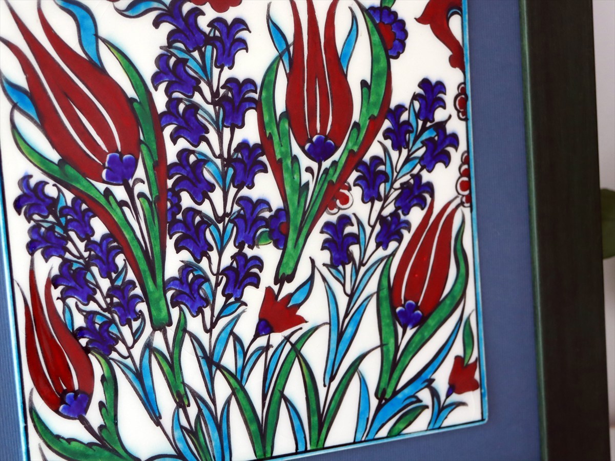 トルコ陶器 手書きタイル 1枚額 H32×W32×D1.5cm チューリップ Turkish Hand Paint Tile