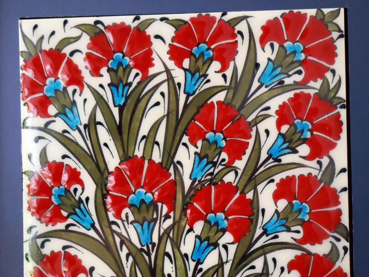 トルコ陶器 手書きタイル 1枚額 H29×W29×D1.5cm カーネーション Turkish Hand Paint Tile