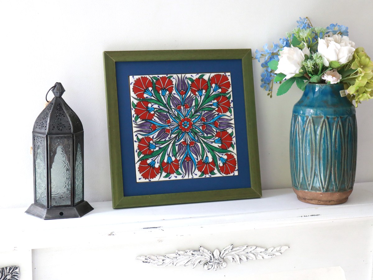 トルコ陶器 手書きタイル 1枚額 H29×W29×D1.5cm チューリップ&カーネーション Turkish Hand Paint Tile