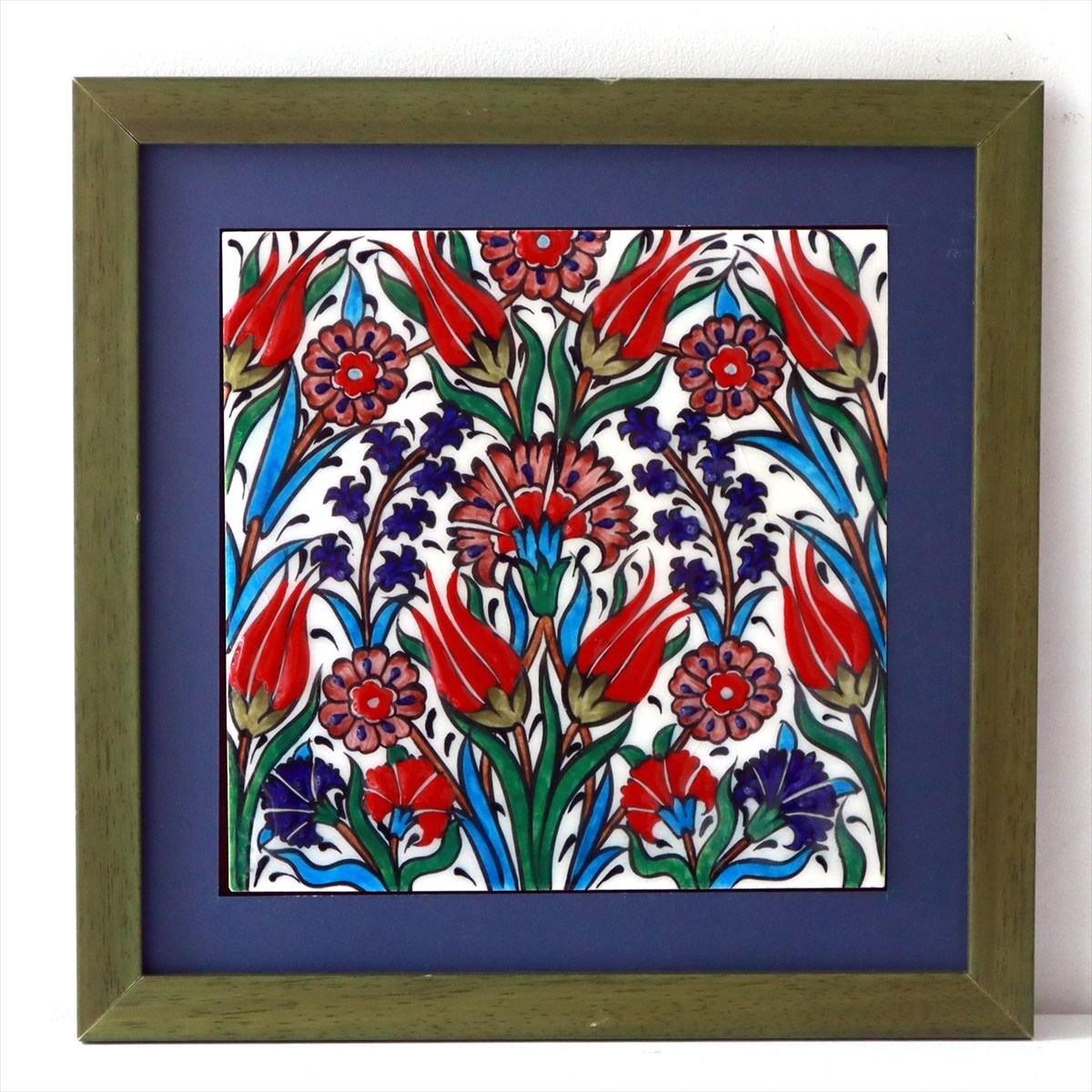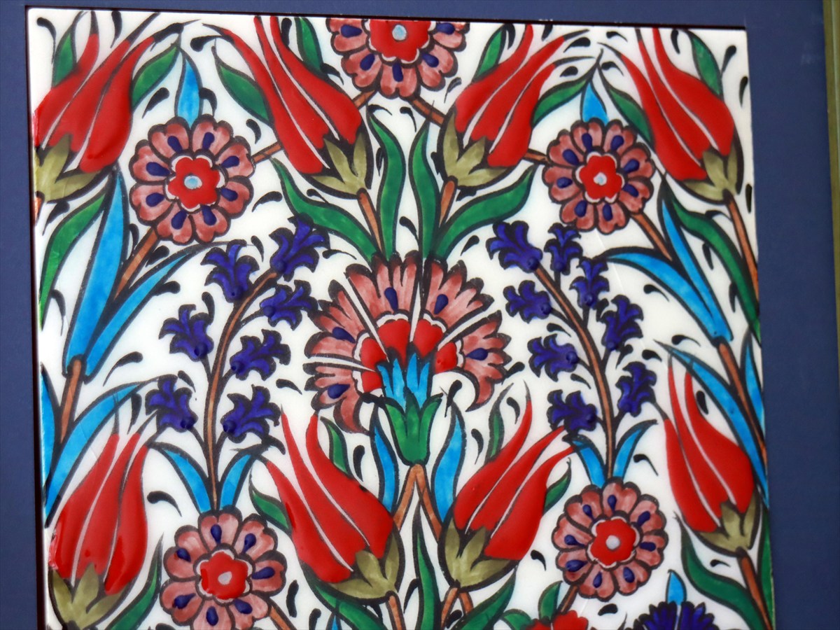 トルコ陶器 手書きタイル 1枚額 H29×W29×D1.5cm チューリップ&カーネーション Turkish Hand Paint Tile
