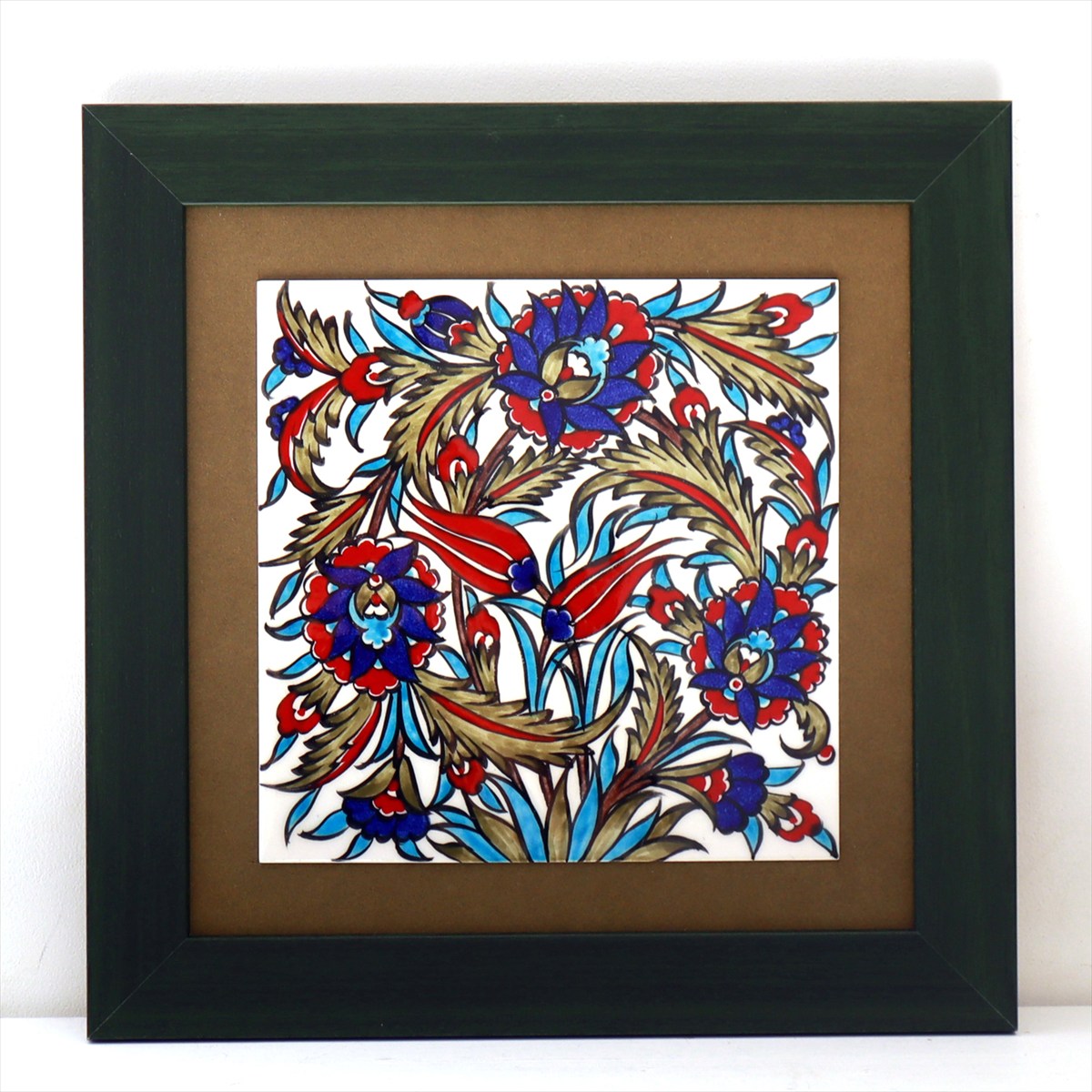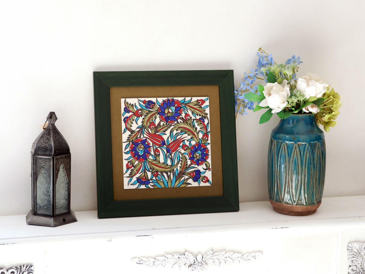 トルコ陶器 手書きタイル 1枚額 H32×W32×D1.5cm チューリップ&カーネーション Turkish Hand Paint Tile