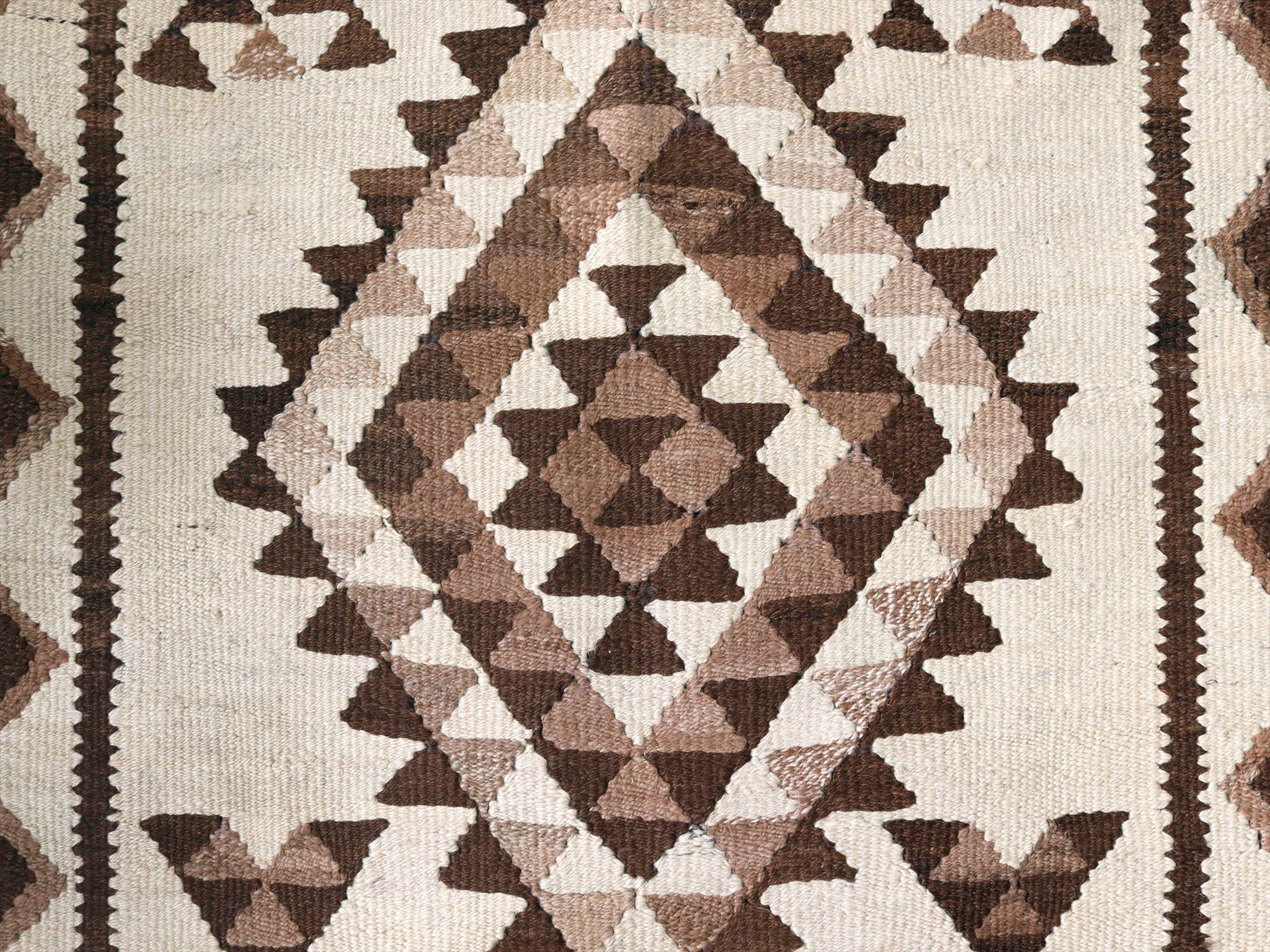トルコ北東部、カルス地方で織られたキリム。今回、似たようなデザインのキリムがまとまって入荷していますが、もともと大判だったものをカットすることによりこちらの大きさになりました。ベージュベースに幾何学モチーフとメダリオンが織られていますが、枠とモチーフのデザインが途中で途切れていて、もともとは細長いサイズのキリムであったことがわかります。