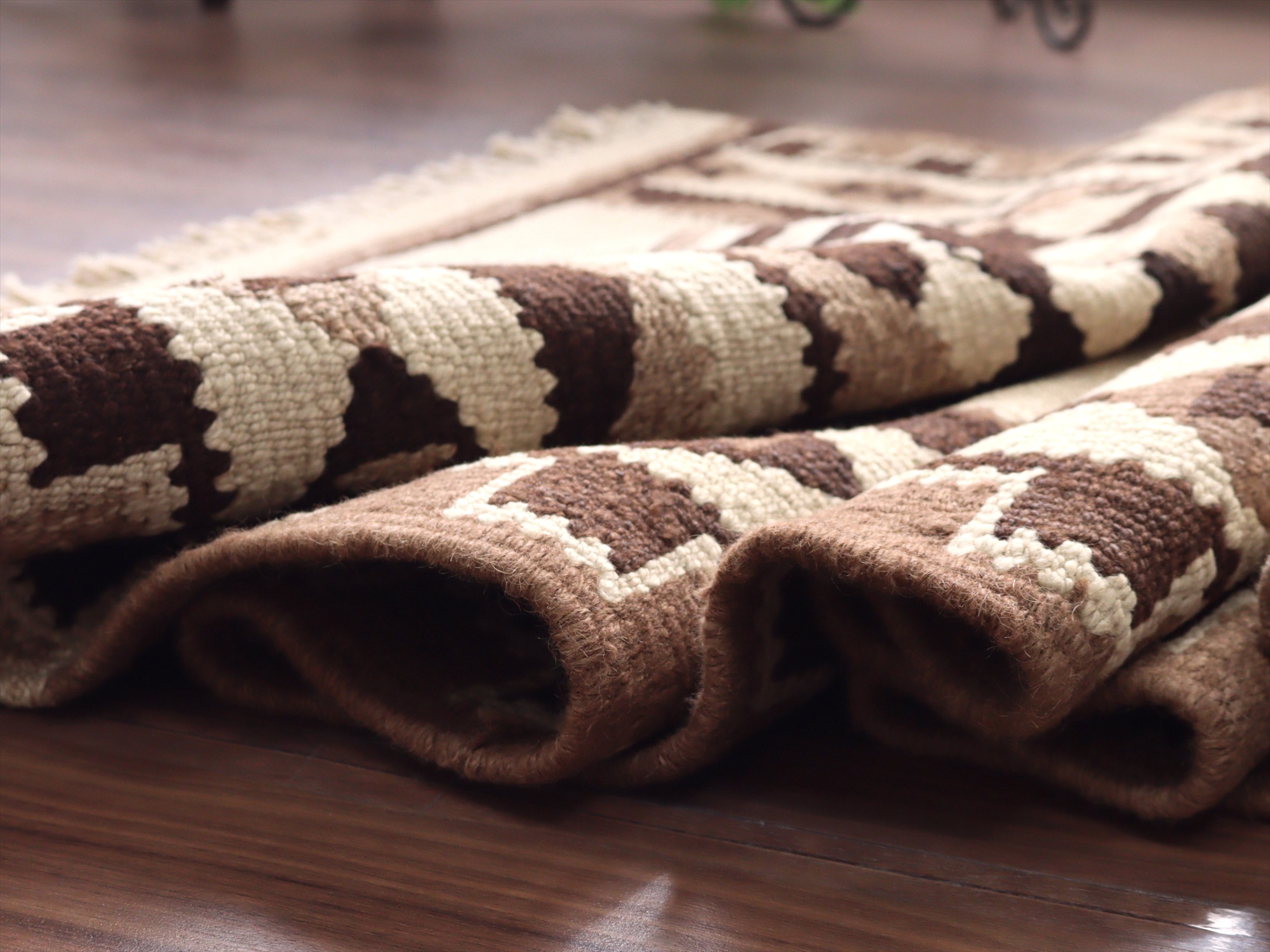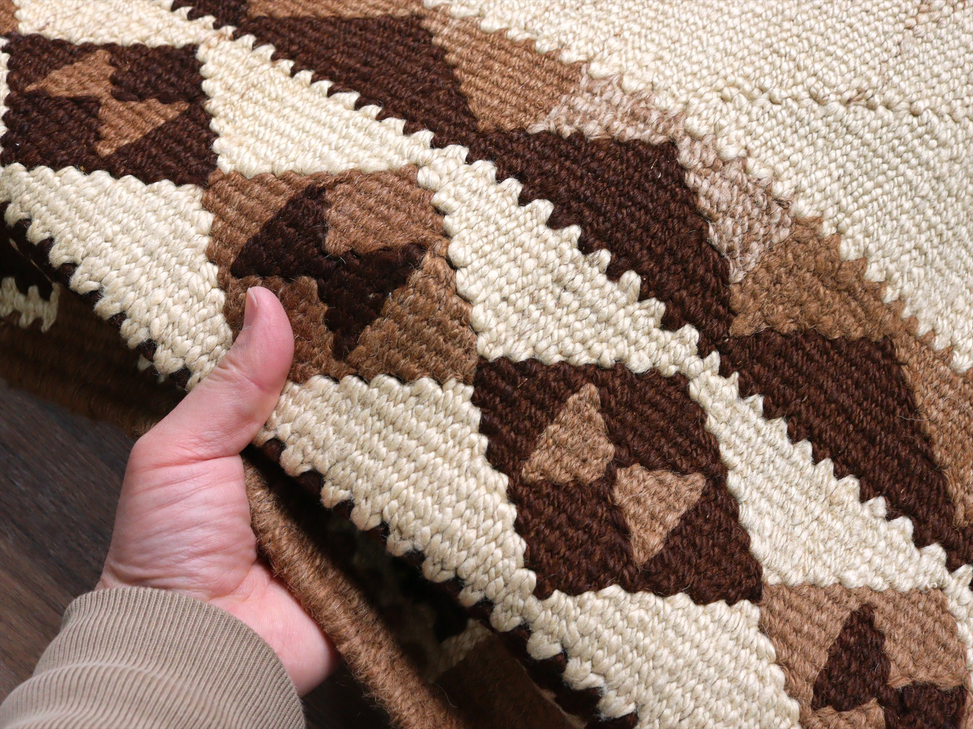 トルコ北東部、カルス地方で織られたキリム。今回、似たようなデザインのキリムがまとまって入荷していますが、もともと大判だったものをカットすることによりこちらの大きさになりました。ベージュベースに幾何学モチーフとメダリオンが織られていますが、枠とモチーフのデザインが途中で途切れていて、もともとは細長いサイズのキリムであったことがわかります。