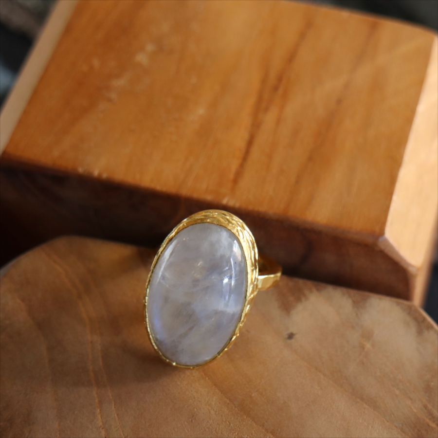乳白色の大粒の石に幻想的な青みあるシラー(虹色の輝き)が美しい、存在感のあるリングです。ぽってりとボリューム感あるムーンストーンは艶やかで上品な印象です。